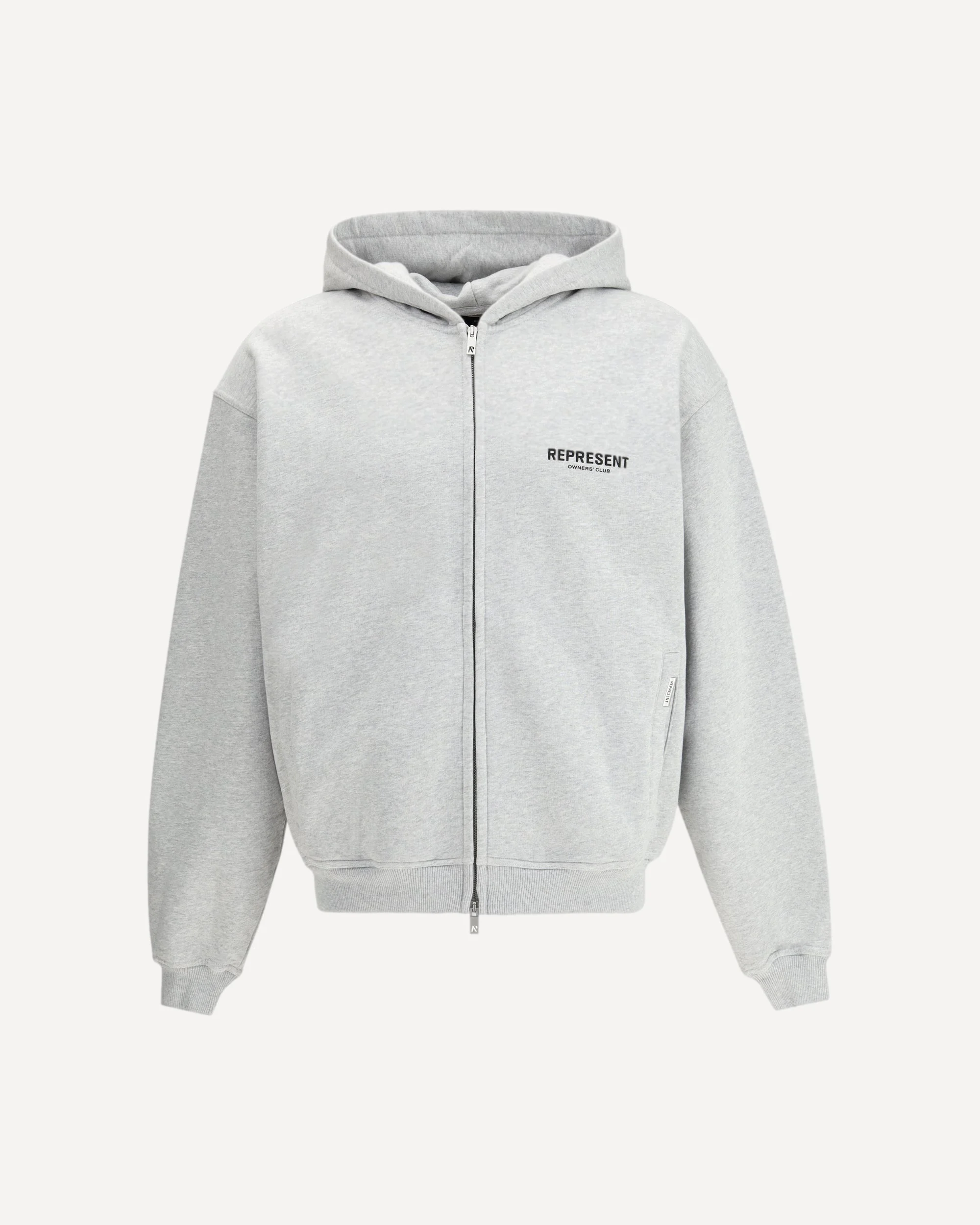Cotton Hoodie by Represent, double-slider zipper closure, two front welt pockets with flaps, ribbed cuffs, ribbed hem, iconic brand monogram printed in contrast on front, iconic brand monogram printed in contrast on back, monochrome pattern, regular fit. DETAILS - Sku: OCM41122_ASHGREY - Season: SS26 - Fit: Oversize - Composition: GENERAL 100% Cotton - MADE IN PORTUGAL