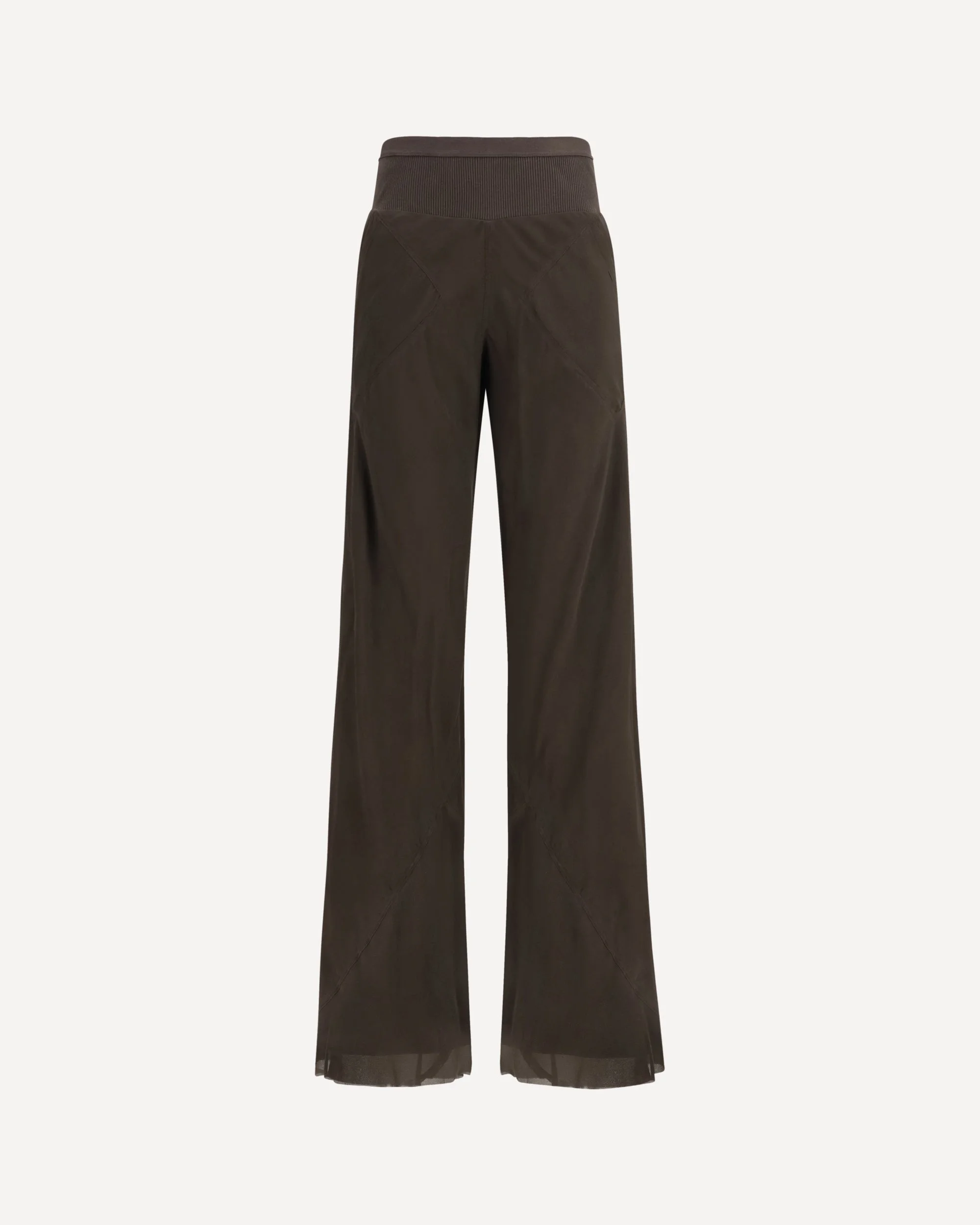 The Bias Pants with a bias-cut and floor-length, by Rick Owens feature a loose fit with diagonal bias seams tracing around the legs. Square side pockets add functional structure, while the elasticated ribbed waistband and raw-cut hems enhance the deconstructed attitude. Crafted from mediumweight enzyme-finished washed cupro satin, the fabric is fluid with a soft peach-like handfeel, expressing the refined and experimental aesthetic of the FW25 collection. DETAILS - Sku: RP01F6301_78 - Season: SS26 - Fit: Regular - Composition: OUTER 100% Silk INNER 100% Cupro - MADE IN ITALY