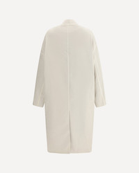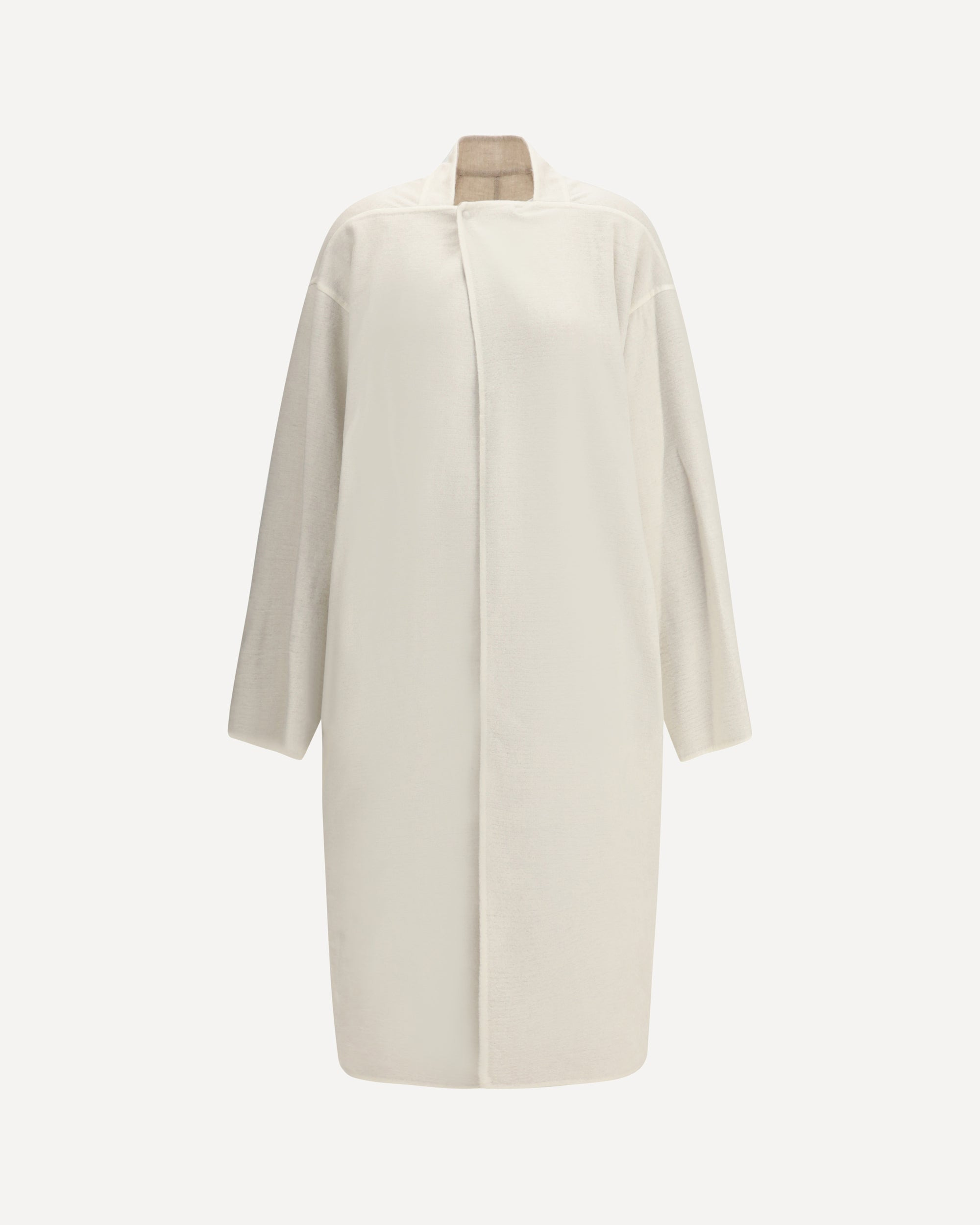 Rick Owens' off-white Island coat features an asymmetrical front overlay, relaxed fit and straight hem. DETAILS - Sku: RP02E4909DBC_1108 - Season: AW25 - Fit: Oversize - Composition: GENERAL 97% Camel 3% Fleece Wool - MADE IN ITALY