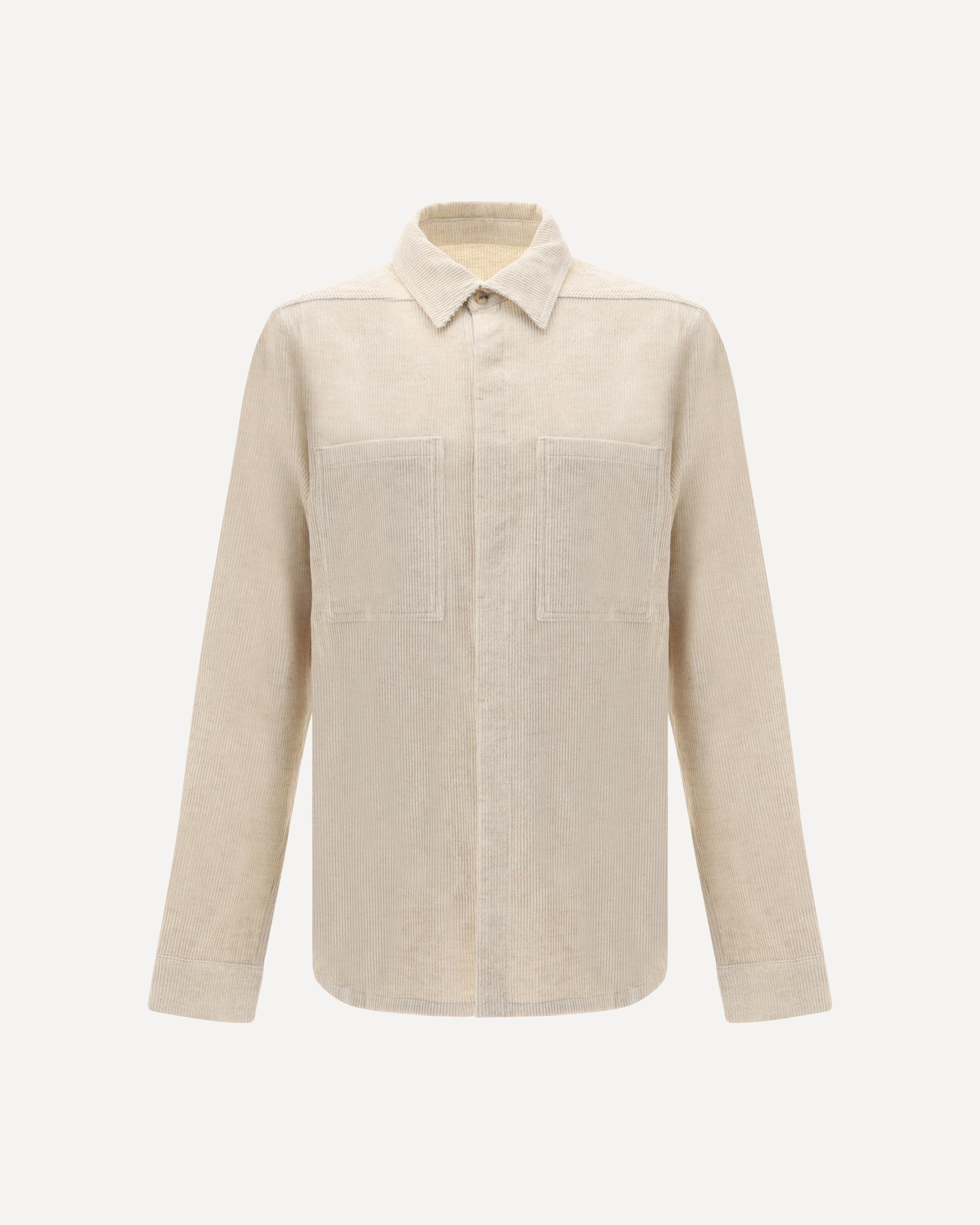 The Rick Owens Corduroy Shirt combines sophisticated textures with clean lines. Featuring a classic collar and front button closure, it has two patch pockets on the front that add a utilitarian touch to the minimalist design. DETAILS - Sku: RU02E1292MLC_21 - Season: AW25 - Fit: Regular - Composition: GENERAL 74% Cotton 26% Linen - MADE IN ITALY