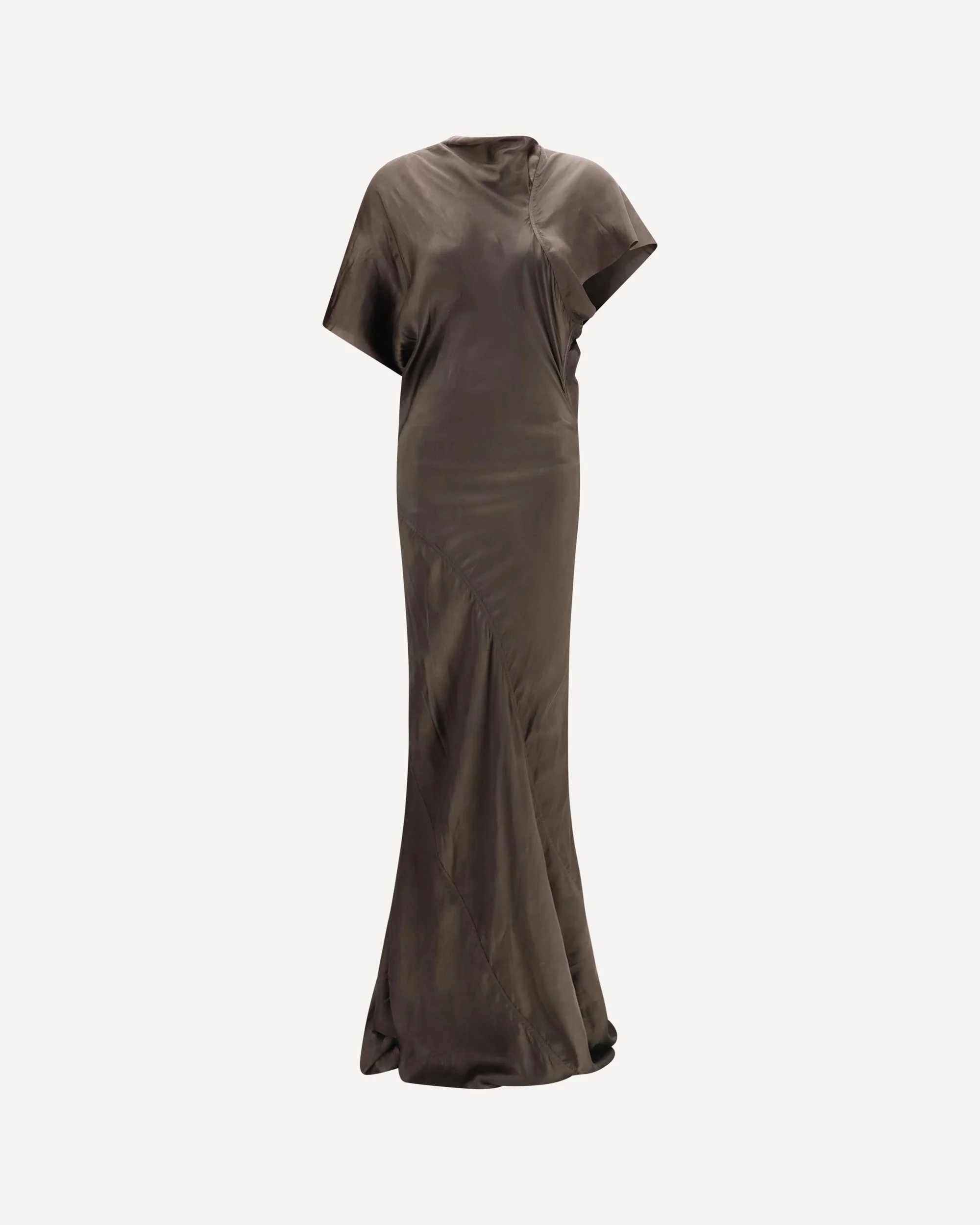 The Seb Dress with pull-on styling, draped neckline and back shoulder cut-out by Rick Owens embodies sculptural elegance with an essential edge. Crafted from heavyweight satin and left unlined, it enhances the silhouette with fluid, enveloping construction. The draped neckline adds depth and movement, while the back cut-out introduces a distinctive contemporary detail. This Gown by Rick Owens blends minimalism with dramatic sophistication. DETAILS - Sku: RP01F6500_78 - Season: SS26 - Fit: Regular - Composition: GENERAL 100% Cupro - MADE IN ITALY