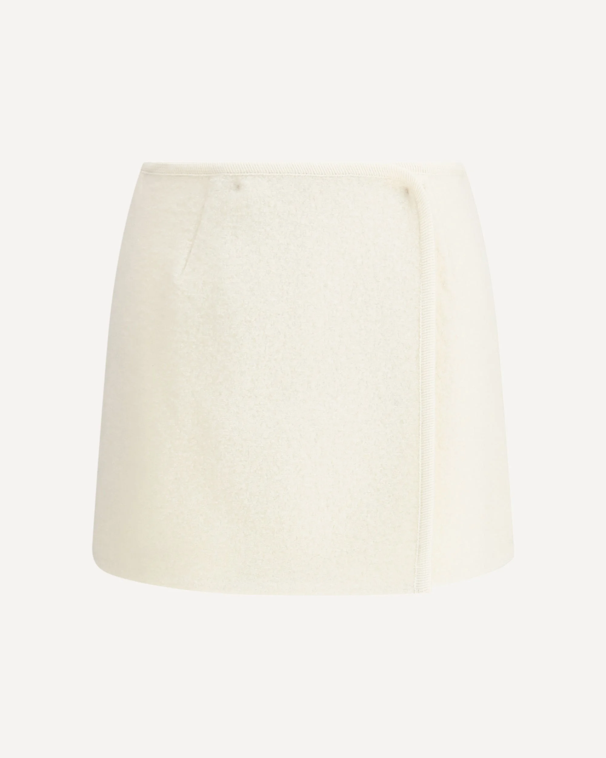 The Walker wrap mini Skirt by Rier is crafted from 100% wool, woven like a knit and felted like a Loden, ensuring lightness, natural elasticity, and wrinkle resistance while providing excellent temperature regulation. The design features a double-breasted overlapped closure with two hidden corozo nut buttons, sitting perfectly at the waist for an elegant and functional silhouette. Inspired by garments first documented in the Middle Ages and reinterpreted for modern times, the Walker is an icon of craftsmanship and sustainability, as it does not release microplastics and requires minimal care. DETAILS - Sku: SKT20X03_WHITE - Season: AW25 - Fit: Slim - Composition: GENERAL 100% Fleece Wool - MADE IN AUSTRIA