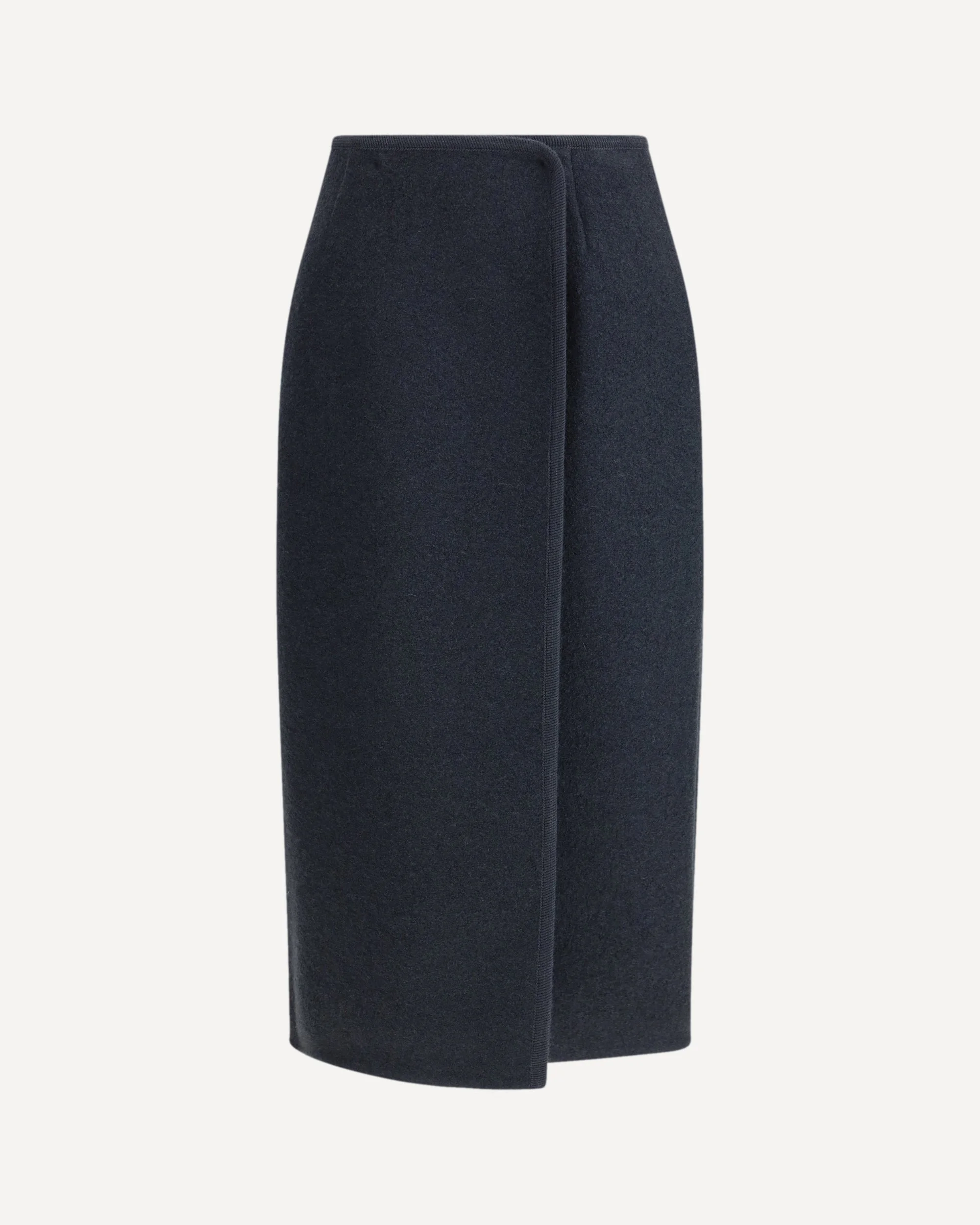 The Walker Wrap Midi Skirt by Rier is made from a 100% undyed wool blend, woven like a knit and felted like a Loden. This technique gives the garment lightness, natural stretch, and wrinkle resistance, while offering excellent protection and temperature regulation. The skirt features a double-breasted overlapped closure with two horn buttons, sitting perfectly at the waist for a clean and refined silhouette. Inspired by garments first documented in the Middle Ages and reinterpreted in a modern key, the Walker skirt embodies craftsmanship and sustainability, as it does not release microplastics and requires very little maintenance. DETAILS - Sku: SKT19X03_PLOMBE - Season: AW25 - Fit: Regular - Composition: GENERAL 100% Fleece Wool - MADE IN AUSTRIA