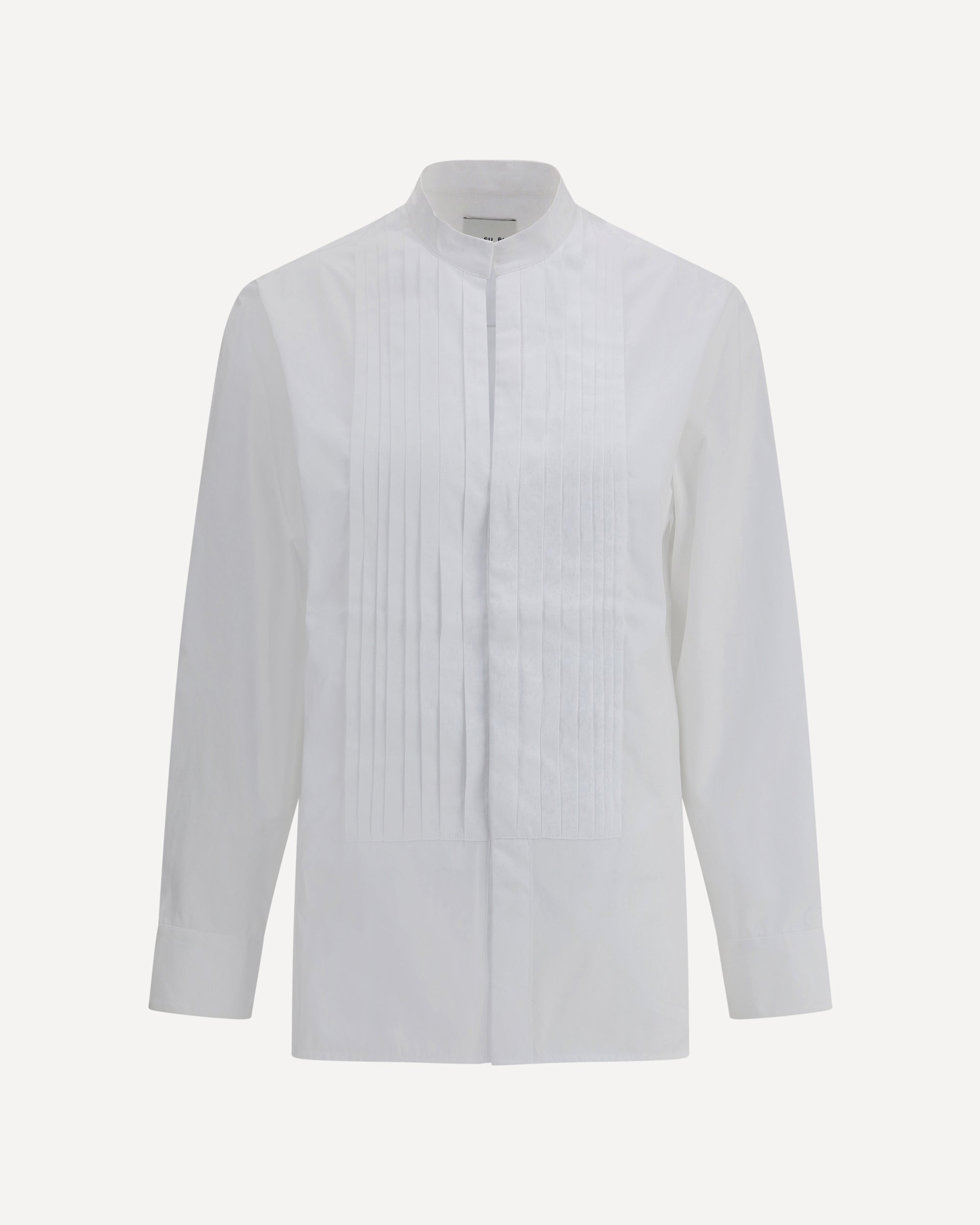 Sa Su Phi's Petra Tuxedo Shirt by Sa Su Phi is an elegant and refined garment designed for a sophisticated look. The front closure with concealed buttons gives a clean, minimalist look, while the mandarin collar adds a touch of modernity and class. The pleat detail on the front enriches the design with an element of texture that enhances the silhouette, creating an elegant and structured effect. Perfect for those seeking a versatile shirt with a distinctive style, ideal for both formal occasions and more contemporary looks. DETAILS - Sku: S25112_0100 - Season: SS25 - Fit: Regular - Composition: GENERAL 100% Cotton - MADE IN ITALY