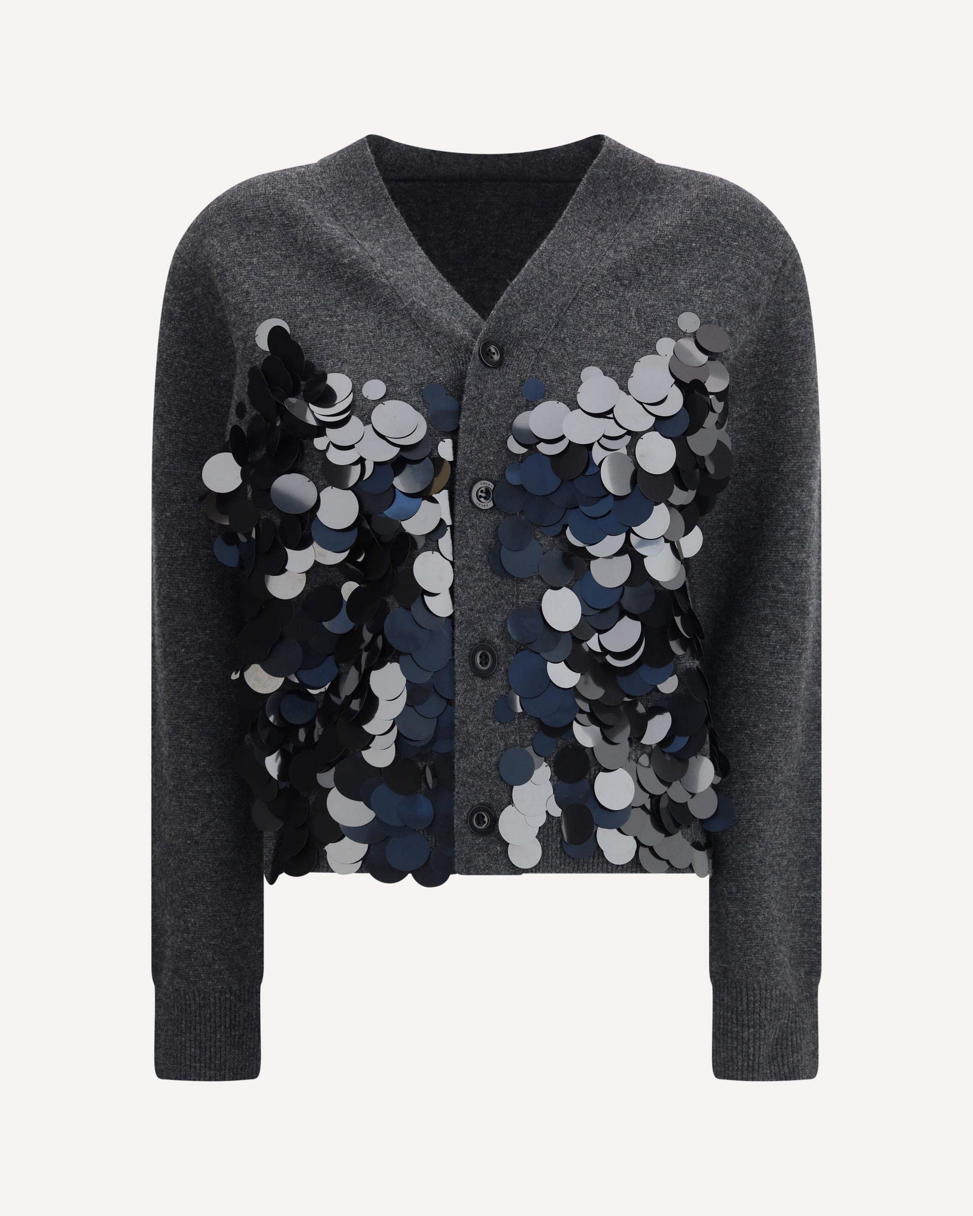 The Sacai Sequined Wool Cardigan fuses knitwear tradition with a contemporary sparkle. Crafted from pure wool, it is defined by oversized sequins across the front, designed to catch the light with every step. A V-neckline and buttoned closure preserve the cardigan’s timeless appeal, while ribbed trims provide structure and balance. DETAILS - Sku: 2508224_327 - Season: AW25 - Fit: Regular - Composition: GENERAL 100% Wool - MADE IN CHINA