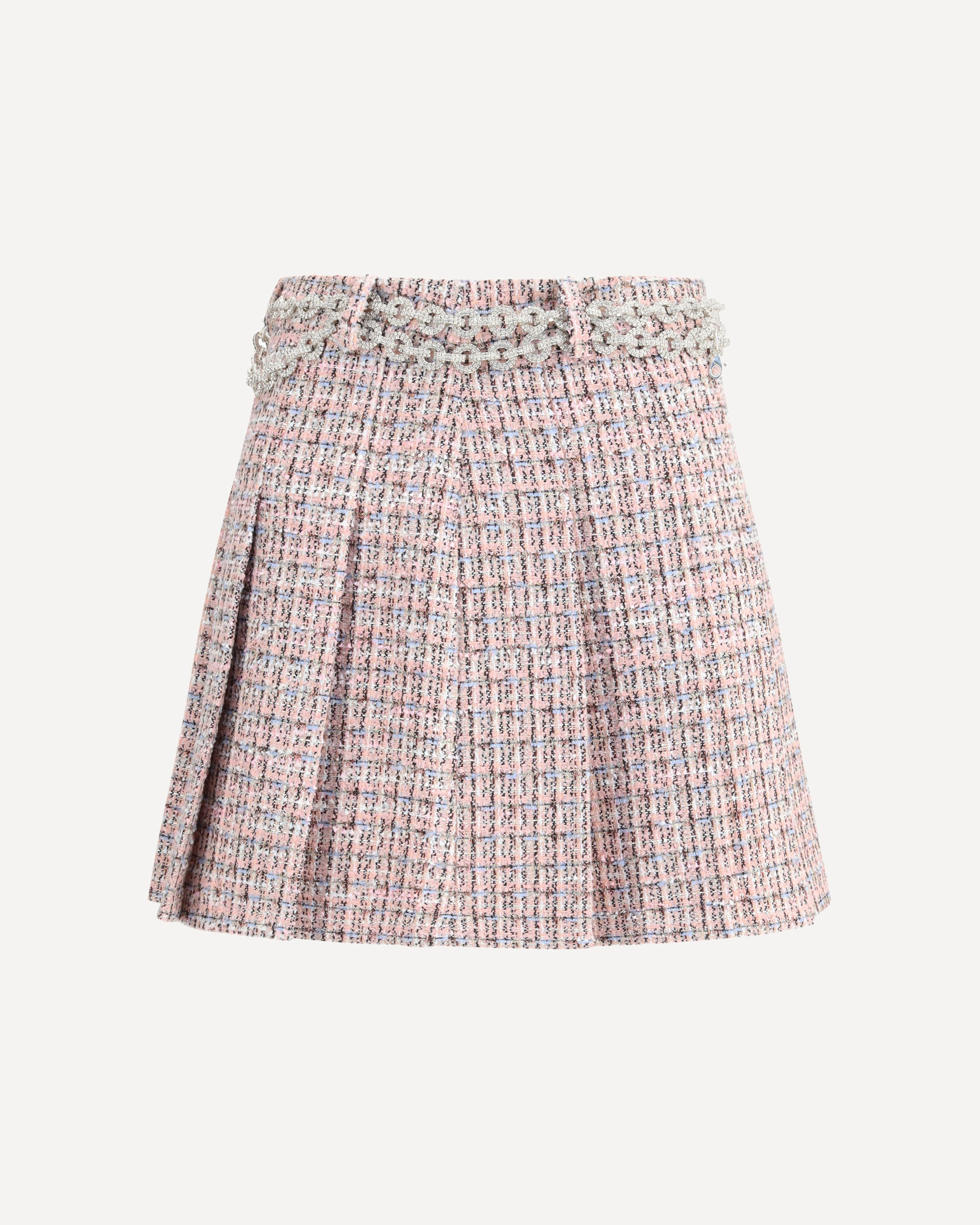 Self-Portrait's Crystal Belted Miniskirt reinterprets the preppy aesthetic with a touch of glamour. Fitted cut and made of pleated pink boucle, it is embellished with a rhinestone chain belt that brightens the look. The hidden side zipper closure keeps the line clean, while the fabric has minimal stretch. For a statement ensemble, a coordinating jacket is available. DETAILS - Sku: AW25048SKAP_PINK - Season: AW25 - Fit: Regular - Composition: GENERAL 10% Wool 85% Polyester 5% Viscose - MADE IN CHINA