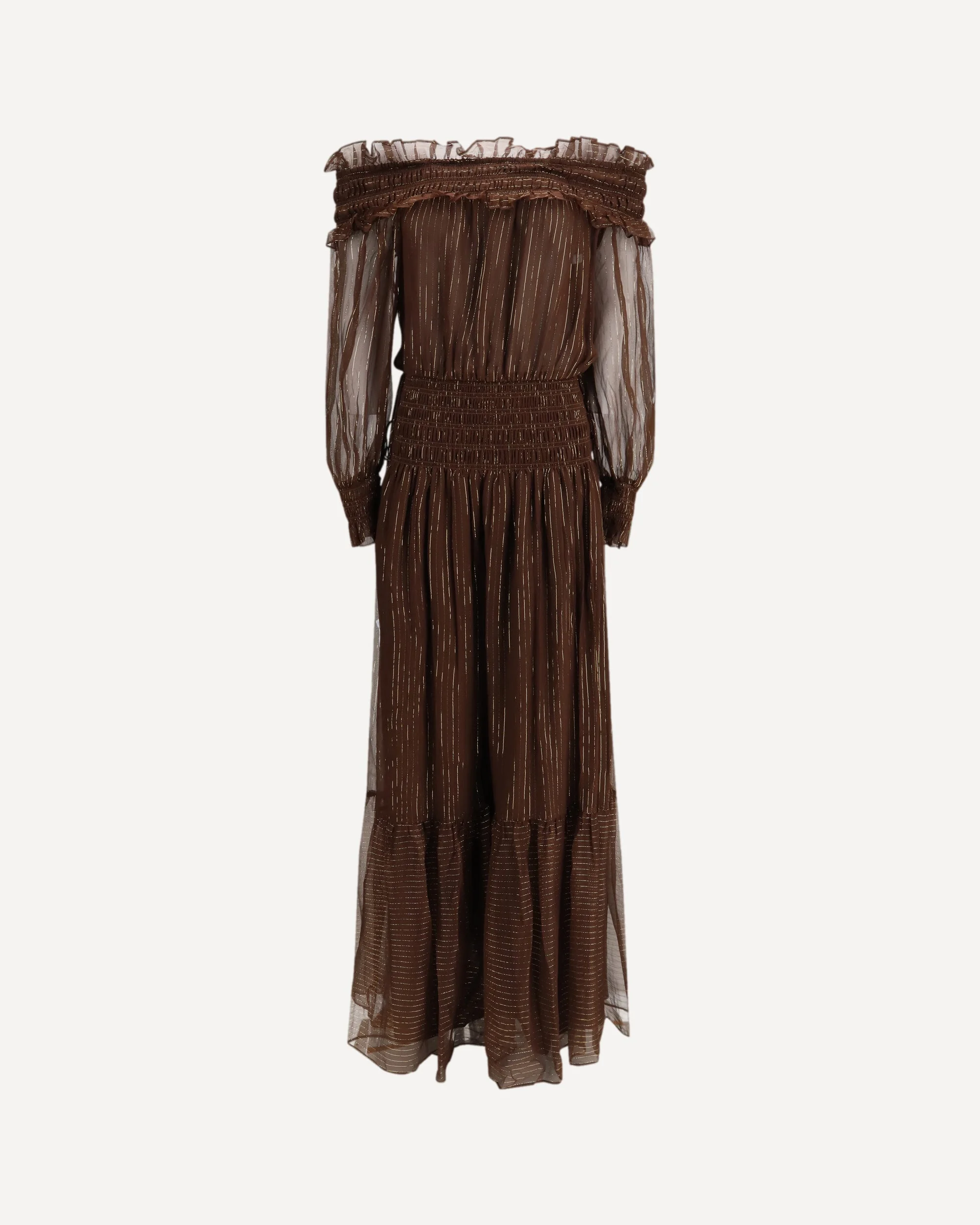 The georgette off shoulder maxi Dress by Self-Portrait captures a light, carefree spirit with an effortless boho allure. Crafted in brown crinkle georgette, it flows softly over the silhouette, enhanced by a romantic off-shoulder neckline and delicate ruffle detailing. The elasticated waistband gently defines the figure, while the knee-length lining ensures comfort and ease. Perfect styled with flat sandals, it’s an ideal choice for relaxed days and beachside evenings. DETAILS - Sku: RS26156XABR_BROWN - Season: SS26 - Fit: Oversize - Composition: GENERAL 95% Silk 5% Other Fibres - MADE IN CHINA