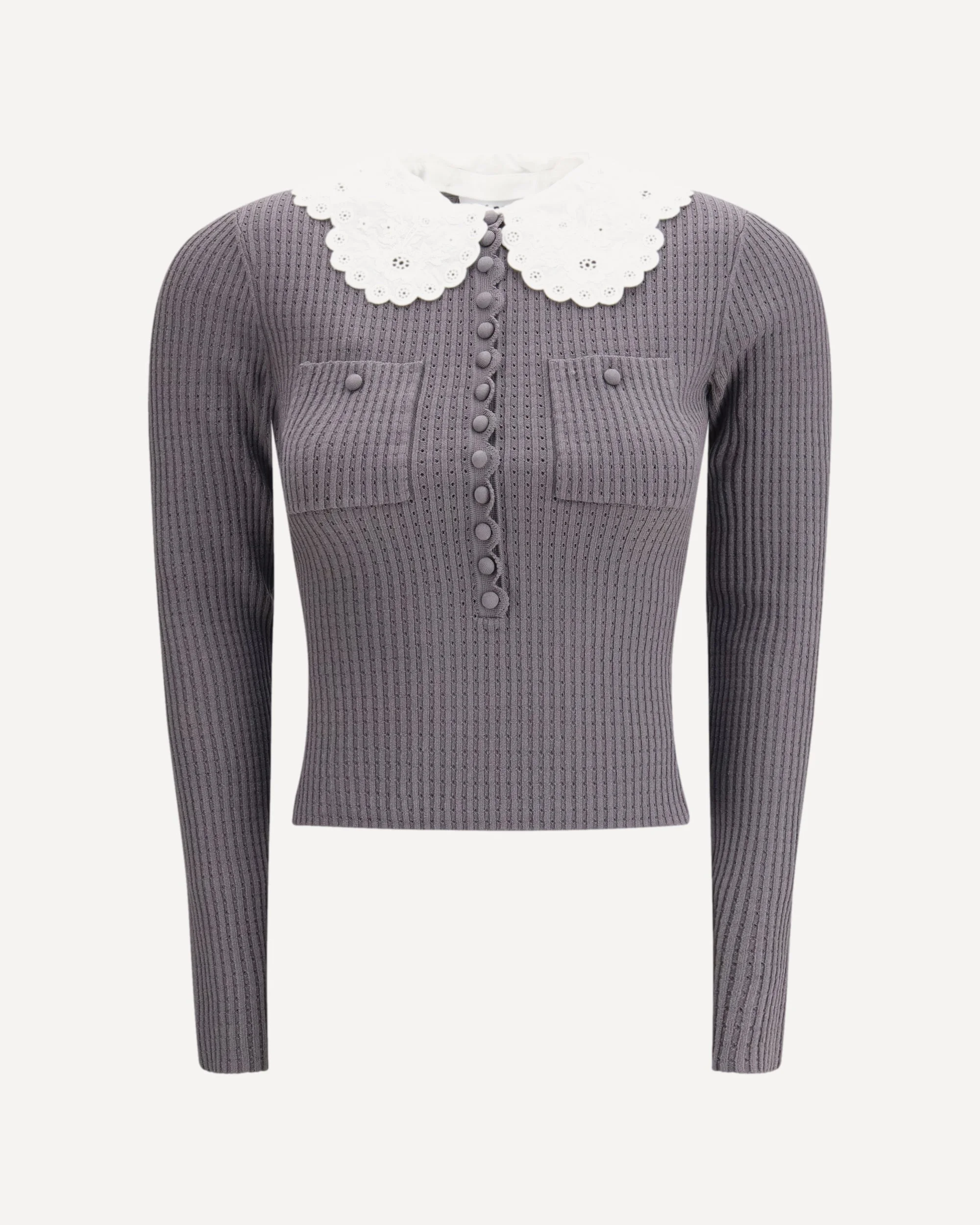 The lace collar knit Top by Self Portrait features a refined grey pointelle knit, enhanced by a contrasting cotton broderie anglaise collar that adds a charming, romantic detail. Designed with a bodycon silhouette, it fits true to size and is crafted from a stretch fabric for comfort and ease of wear. The button-down front completes the look, making it perfect to style with baggy jeans for a modern contrast and an effortlessly chic date-night outfit. DETAILS - Sku: RS26106TAGR_GREY - Season: SS26 - Fit: Slim - Composition: GENERAL 73% Viscose 16% Polyester 10% Polyamide 1% Elastane - MADE IN CHINA
