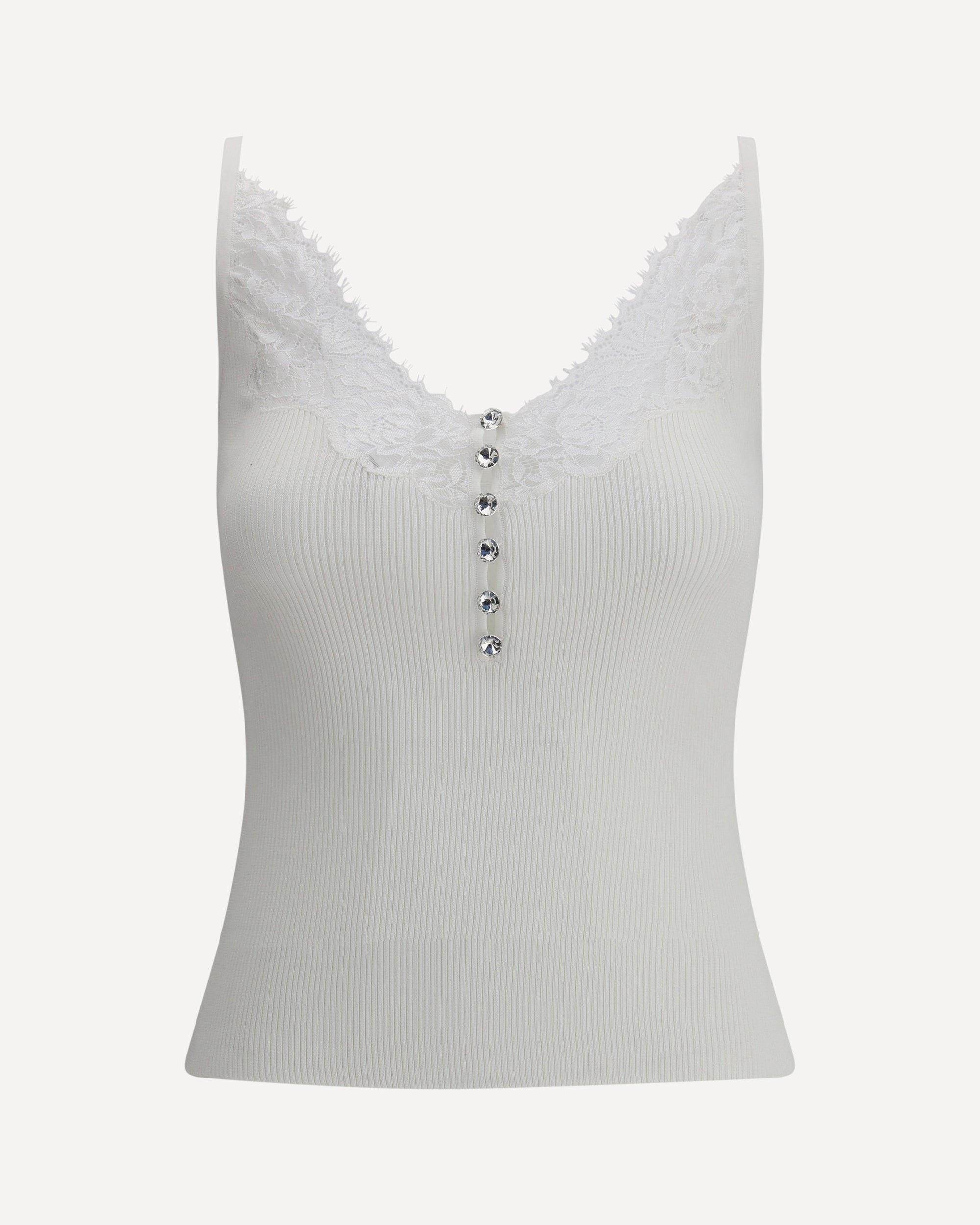 Self-Portrait's lace Top is an elegant and feminine piece featuring thin straps and a refined ribbed design. The lace detail adds delicacy, while the rhinestone buttons on the front add a touch of light and sophistication, making it perfect for romantic and contemporary looks. DETAILS - Sku: PF25042TW_WHITE - Season: AW25 - Fit: Slim - Composition: GENERAL 62% Viscose 38% Polyester - MADE IN CHINA