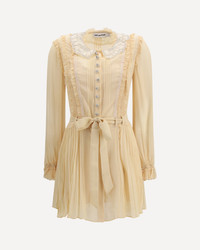 The pleated georgette mini Dress by Self-Portrait blends lightness and refinement through fluid pleats, playful ruffle details, and luminous trims. Designed with a fitted silhouette, it features an embellished collar that frames the neckline with a subtle, jewellery-like sparkle. The button-down front adds a classic touch, while the removable cami lining and detachable belt offer versatility and styling freedom. A graceful piece conceived for special, intimate occasions. DETAILS - Sku: RS26034ST_TAN - Season: SS26 - Fit: Regular - Composition: GENERAL 80% Viscose 20% Polyester - MADE IN CHINA