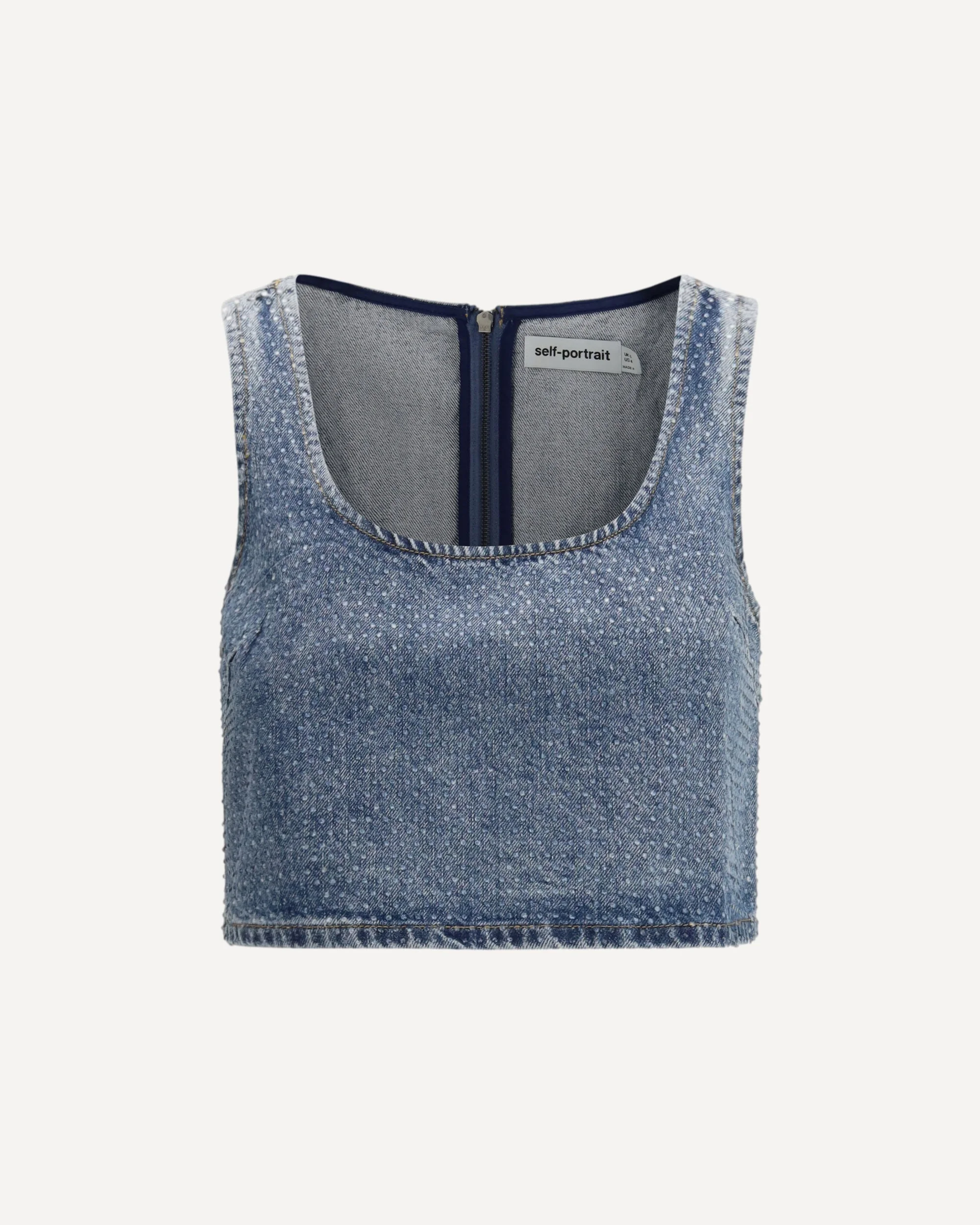 The rhinestone denim crop Top by Self Portrait is designed to shine during special occasions and fun nights out. Crafted from denim, it features all-over rhinestone embellishments that add a dazzling effect. The relaxed fit and cropped length make it perfect to pair with high-waisted pieces, while the exposed zip closure at the back adds a modern edge. True to size, it’s an ideal choice for bold evening looks. DETAILS - Sku: RS26826TBL_BLUE - Season: SS26 - Fit: Slim - Composition: GENERAL 100% Cotton - MADE IN CHINA