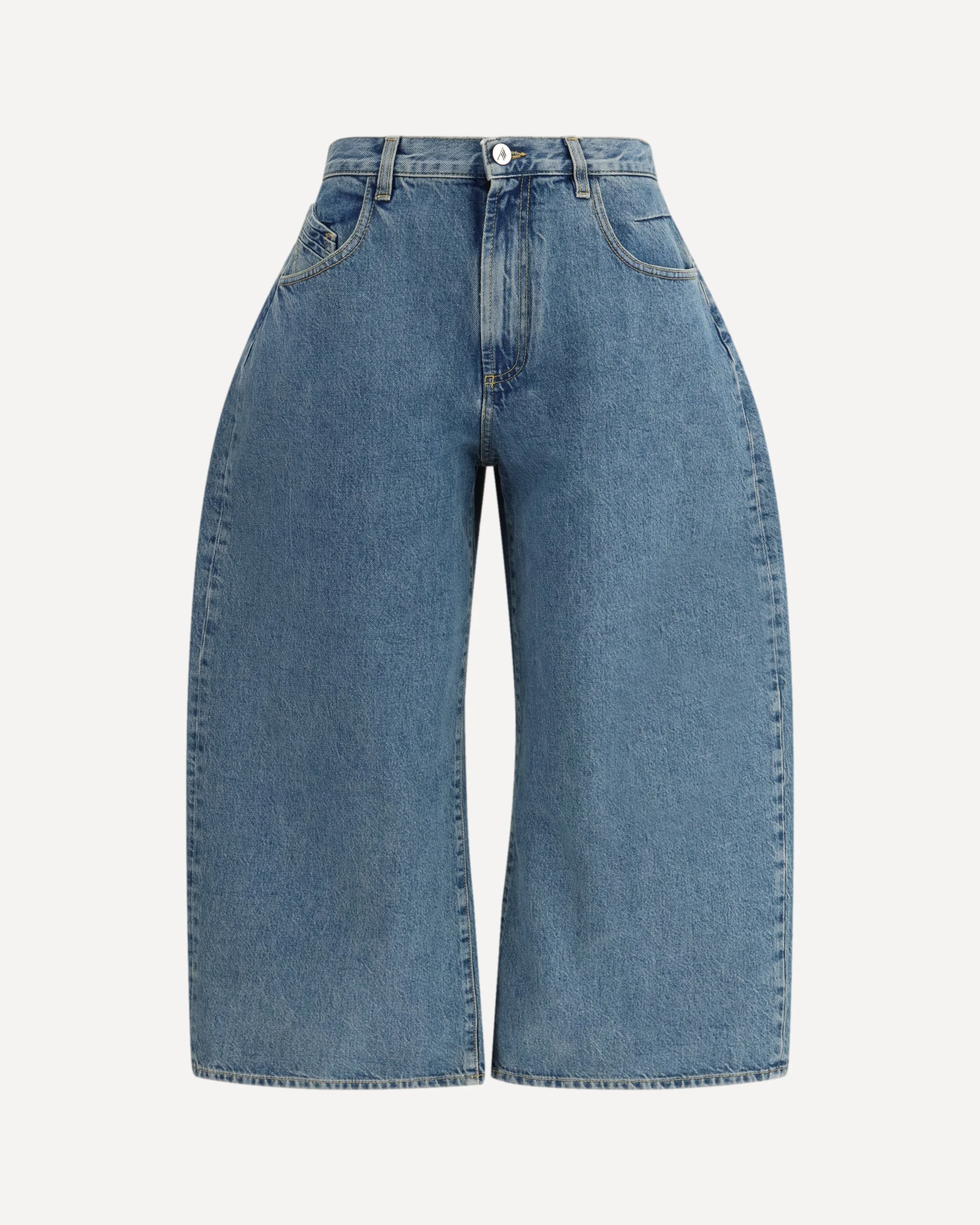 The denim Jeans by The Attico turn an everyday essential into a bold statement through sharp proportions and a distinctive blend of glamour and street attitude. The wide-leg construction with a curved fit shapes a confident silhouette, while the button closure and five-pocket design preserve a classic foundation. Signature back stitching and the logo patch add a marked identity, finished with cropped hems that heighten the visual impact. DETAILS - Sku: 260WCP00293DDD116AA_024 - Season: SS26 - Fit: Oversize - Composition: GENERAL 100% Cotton - MADE IN ITALY