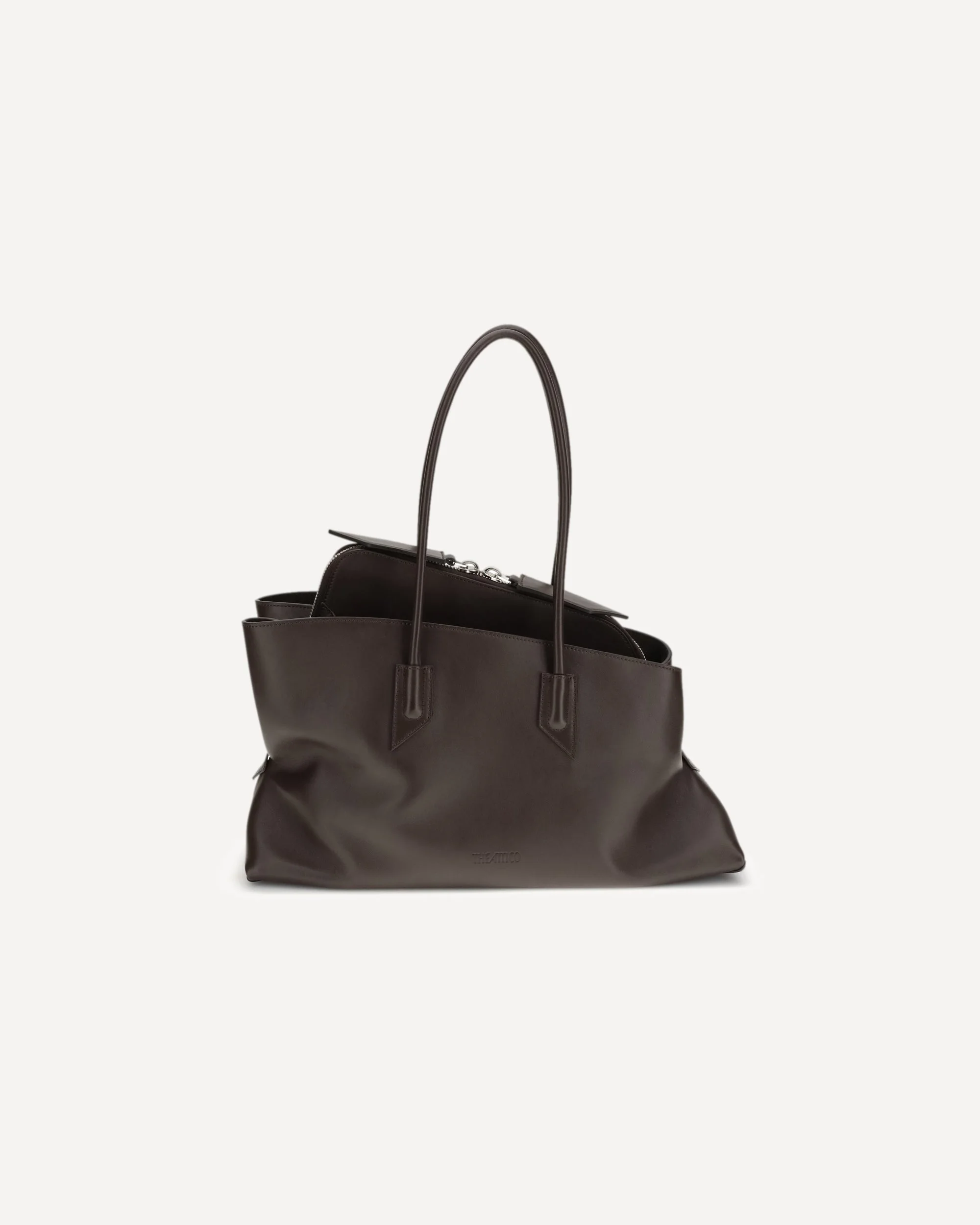 The La Passeggiata Medium leather Shoulder Bag by The Attico is a bold and sophisticated accessory made of with an asymmetrical, geometric design. Equipped with two flat tubular handles at the top, it features a double-slider zipper closure enriched with original geometric details. The brand's iconic signature is pressure-printed on the front in contrast, adding a distinctive touch to this bag with a bold and contemporary style. DETAILS - Sku: 260WAH00054LBT019AA_204 - Season: SS26 - Dimension: 42.5x42.5x16 - Composition: GENERAL 100% Calf Leather Bos Taurus - MADE IN ITALY