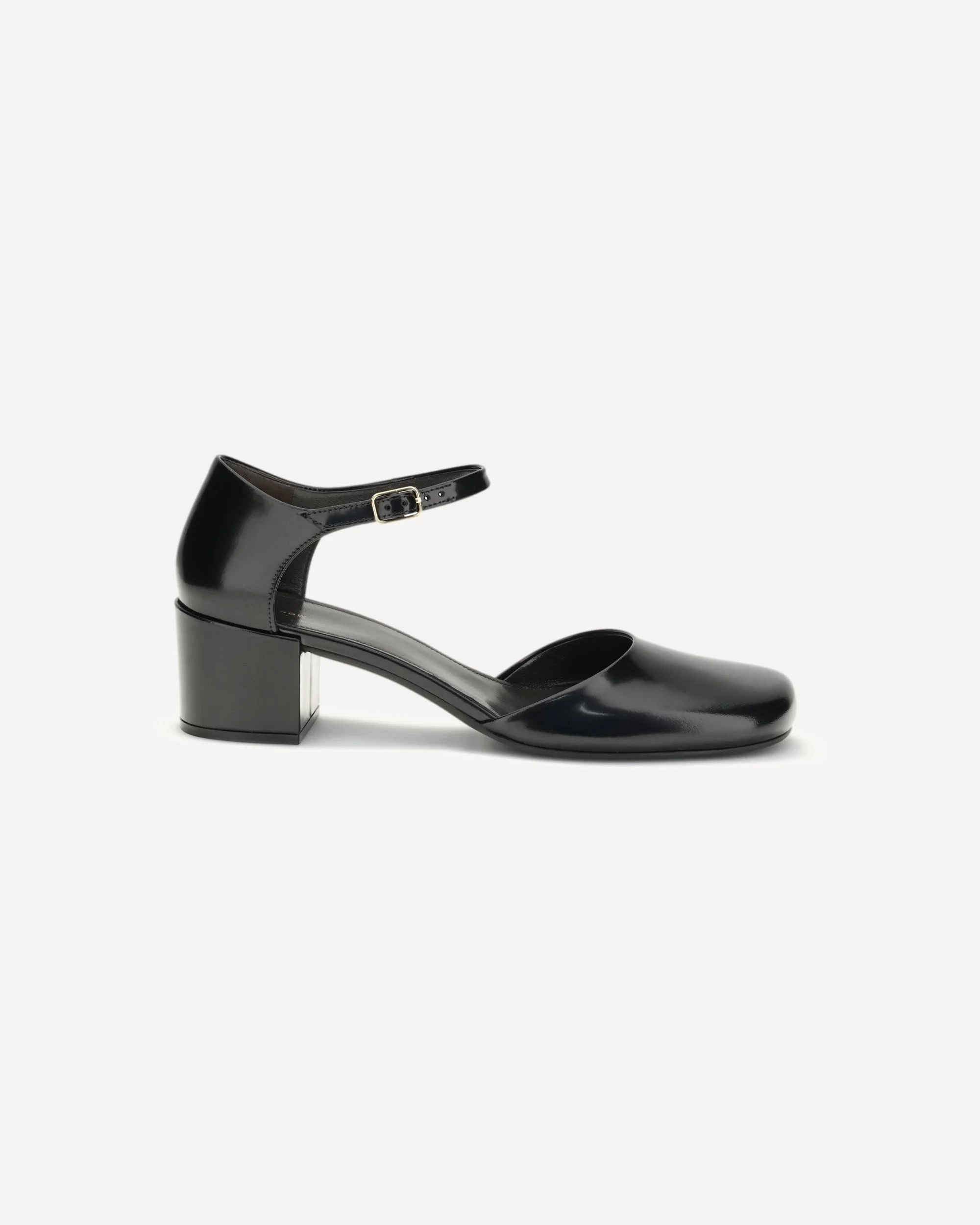 The Penelope Ankle Strap Pumps by The Row are low-heeled shoes crafted from polished patent leather, featuring a square toe and an adjustable ankle strap with buckle. Finished with a rubber sole, they blend sophistication and comfort in a timeless minimalist design. DETAILS - Sku: F1673L604_BLK - Season: AW25 - Composition: SOLE 100% Rubber UPPER 100% Calf Suede - MADE IN ITALY