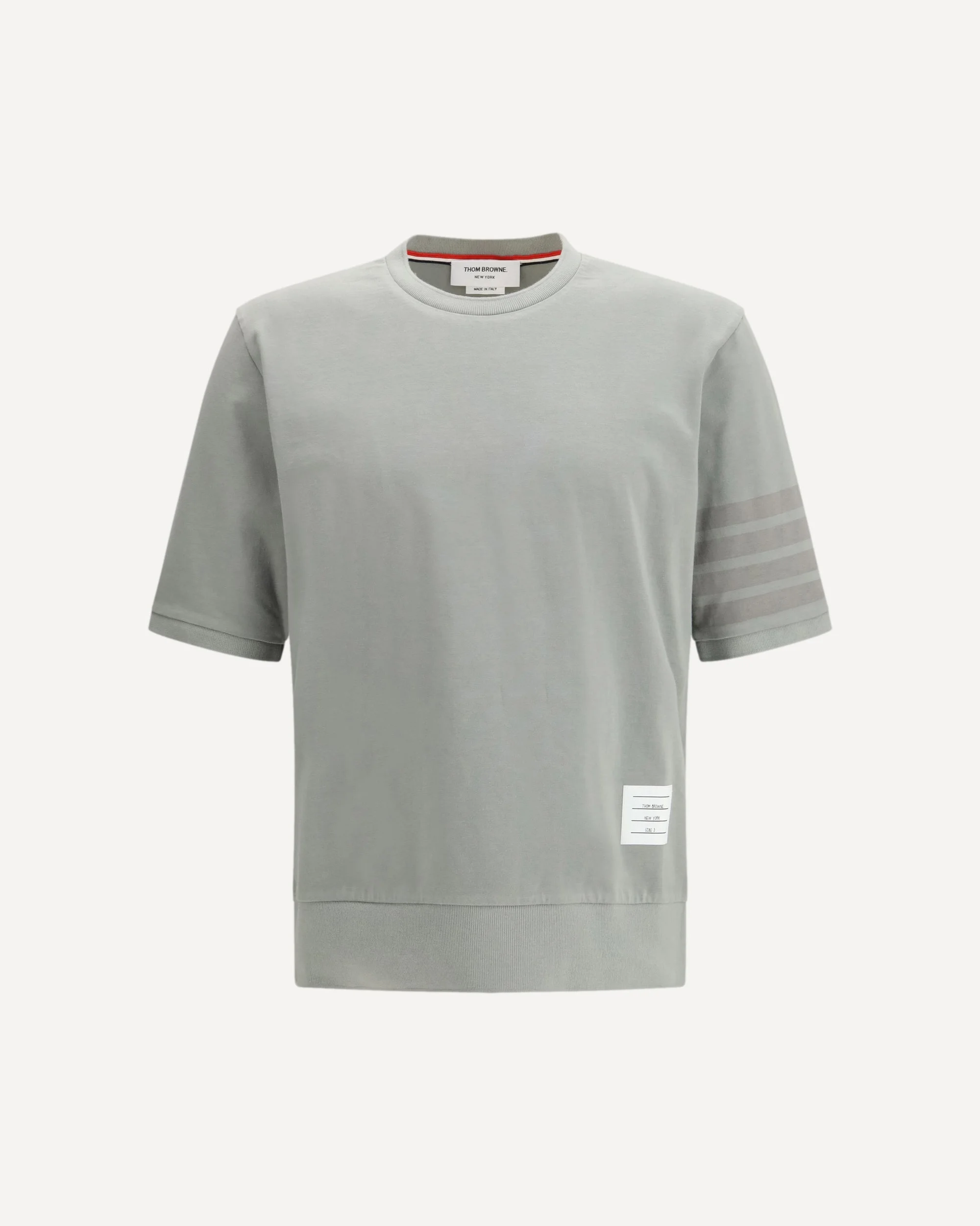 The 4-Bar cotton jersey T-shirt by Thom Browne reflects the brand’s disciplined aesthetic through graphic details and refined proportions. The crew neck creates a clean line, while the elasticated hem adds structure to the silhouette. The 4-Bar motif and the patch applied on the lower left side with the brand name and signature information complete the piece with an iconic and recognizable touch. DETAILS - Sku: MJS303AJ0253_055 - Season: SS26 - Fit: Regular - Composition: GENERAL 100% Cotton - MADE IN ITALY
