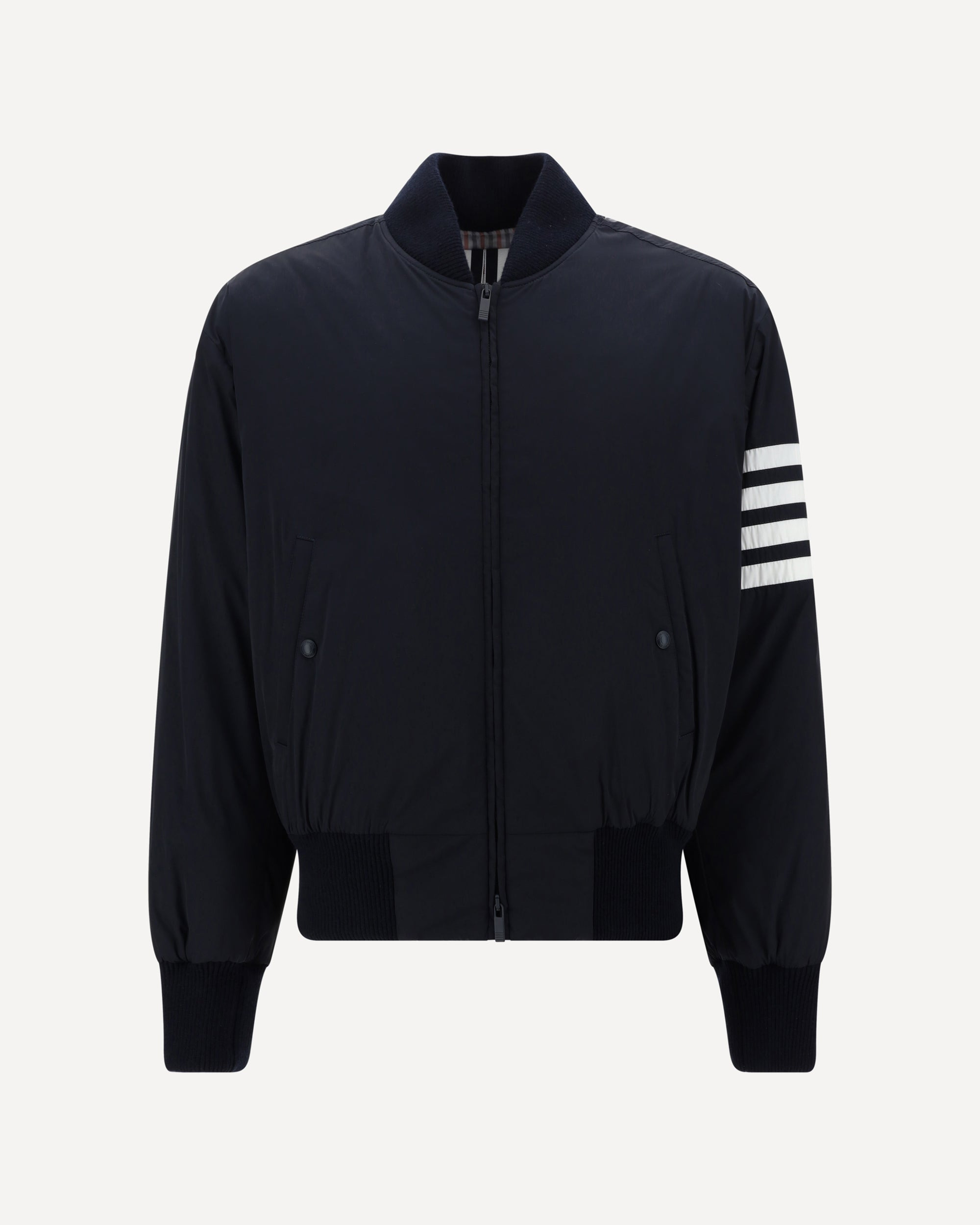 Bomber Jacket by Thom Browne, front zipper closure, high ribbed crew neck, elastic ribbed cuffs, elastic hem, two side welt pockets with zipper for closure, iconic brand bands printed in contrast on left arm, regular fit. DETAILS sku MJD103X07259_415 composition : 100% POLYESTER color : NAVY gender : MAN season : SS23 size chart : MAN NUMERIC category name : JACKETS