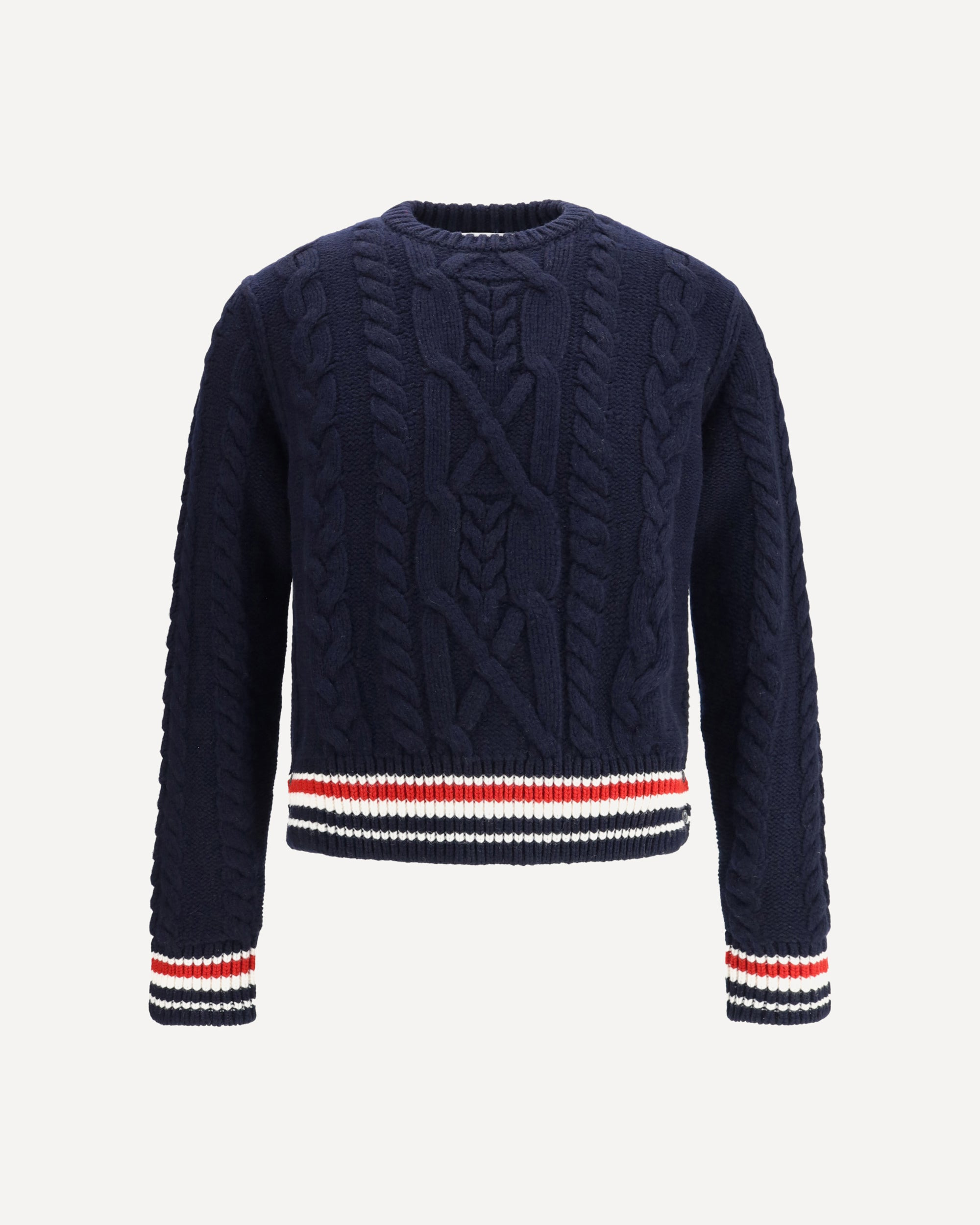 Thom Browne's cable knit Sweater combines tradition and contemporary style with the brand's distinctive elegance. Made of soft wool with a cable-knit construction, it features a ribbed crew neck, hem and cuffs that define its structure and ensure a comfortable fit. The iconic tricolor details on the hem and cuffs add a recognizable and refined touch, an expression of the sartorial DNA of the maison. A timeless garment, perfect for enriching your wardrobe with personality and class. DETAILS - Sku: MKA570AY1005_415 - Season: AW25 - Fit: Regular - Composition: GENERAL 98% Fleece Wool 1% Polyamide 1% Elastane - MADE IN ITALY