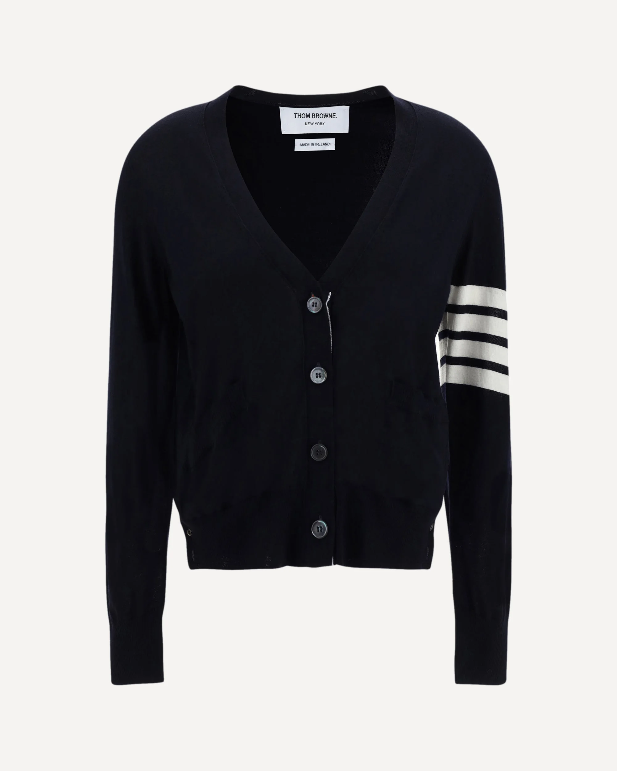 Merino Wool Cardigan by Thom Browne, ribbed front V-neck, front button closure, two side patch pockets on front, monochrome pattern, slim fit, iconic brand horizontal bands on left arm, slight adjustable side slits with buttons. DETAILS sku FKC334AY1014_415 composition : MERINO WOOL 100% color group : BLUE gender : WOMAN season : SS24 size chart : WOMAN IT category name : KNITWEAR