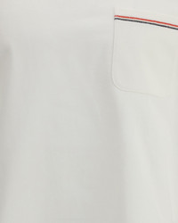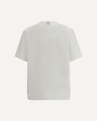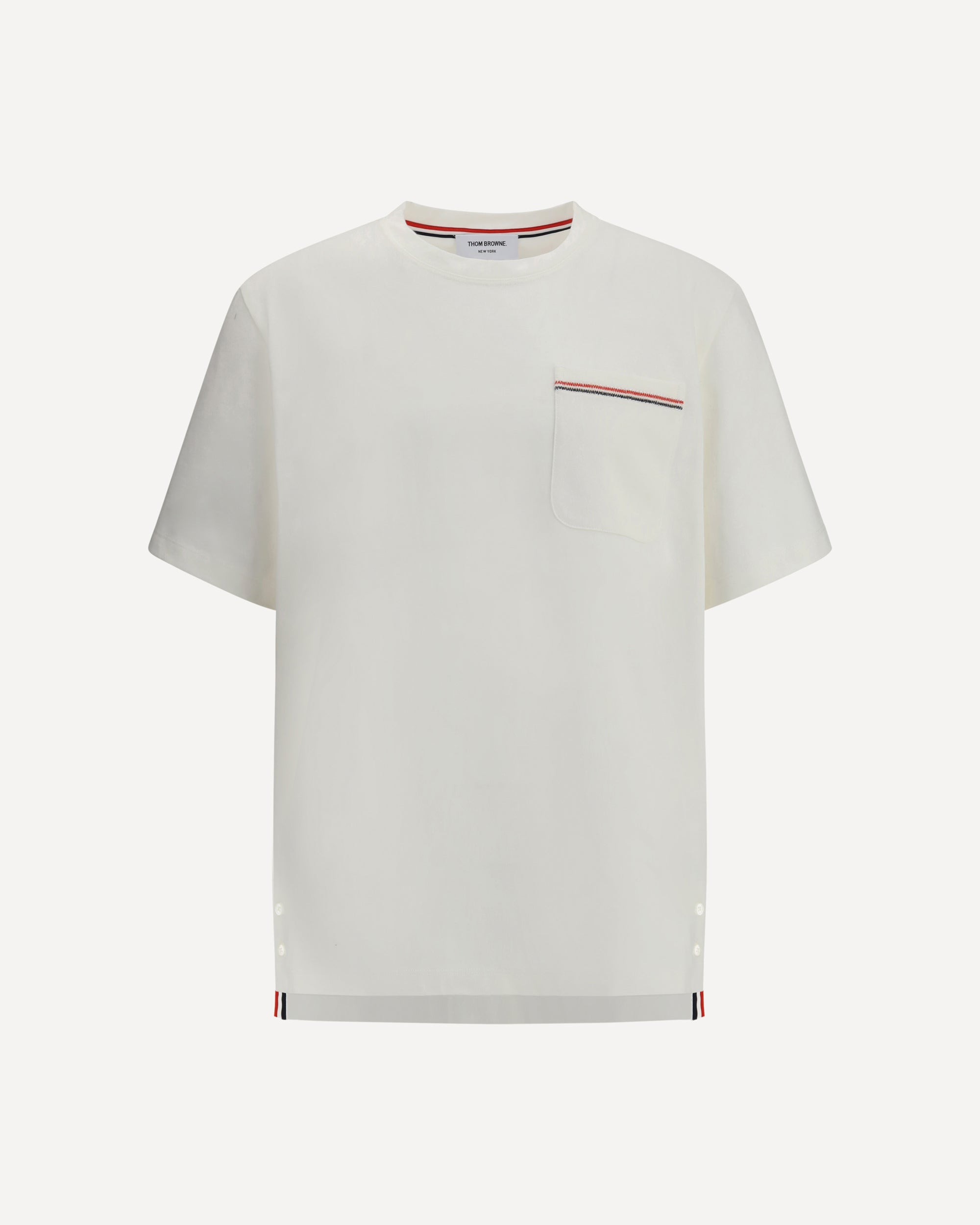 Thom Browne's cotton T-Shirt is an essential garment reimagined with the brand's unmistakable aesthetic. The design features a ribbed crew neck and an asymmetrical hem, enhanced by practical side buttons that add a functional and original touch. On the front, the classic logo patch and a patch pocket stand out, finished with stitching in the iconic colors of the maison. DETAILS - Sku: MJS295EJ0235_100 - Season: AW25 - Fit: Oversize - Composition: GENERAL 100% Cotton - MADE IN ITALY