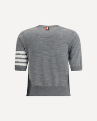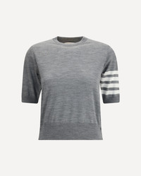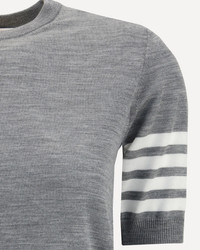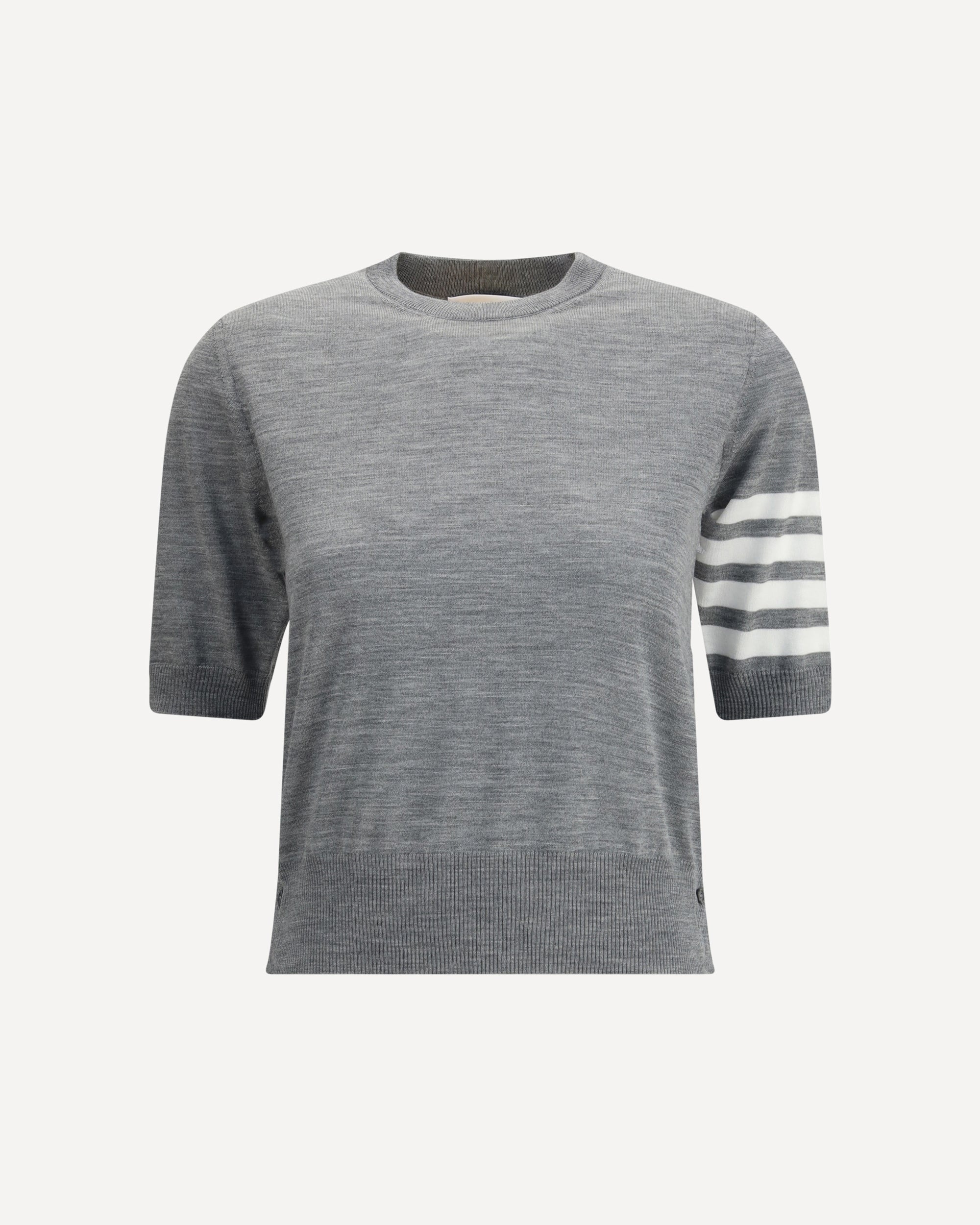 Thom Browne's knit T-Shirt is a garment with a clean and distinctive style. With a ribbed crew neck and hems, it features the brand's iconic bands on the left sleeve, a detail that underscores its unique identity. The ribbed hem with slight side slits adds a touch of modernity and comfort, making it perfect for a casual yet sophisticated look. A versatile must-have for any wardrobe. DETAILS - Sku: FKA471BY1014_055 - Season: AW25 - Fit: Regular - Composition: GENERAL 99% Fleece Wool 1% Polyamide - MADE IN ITALY