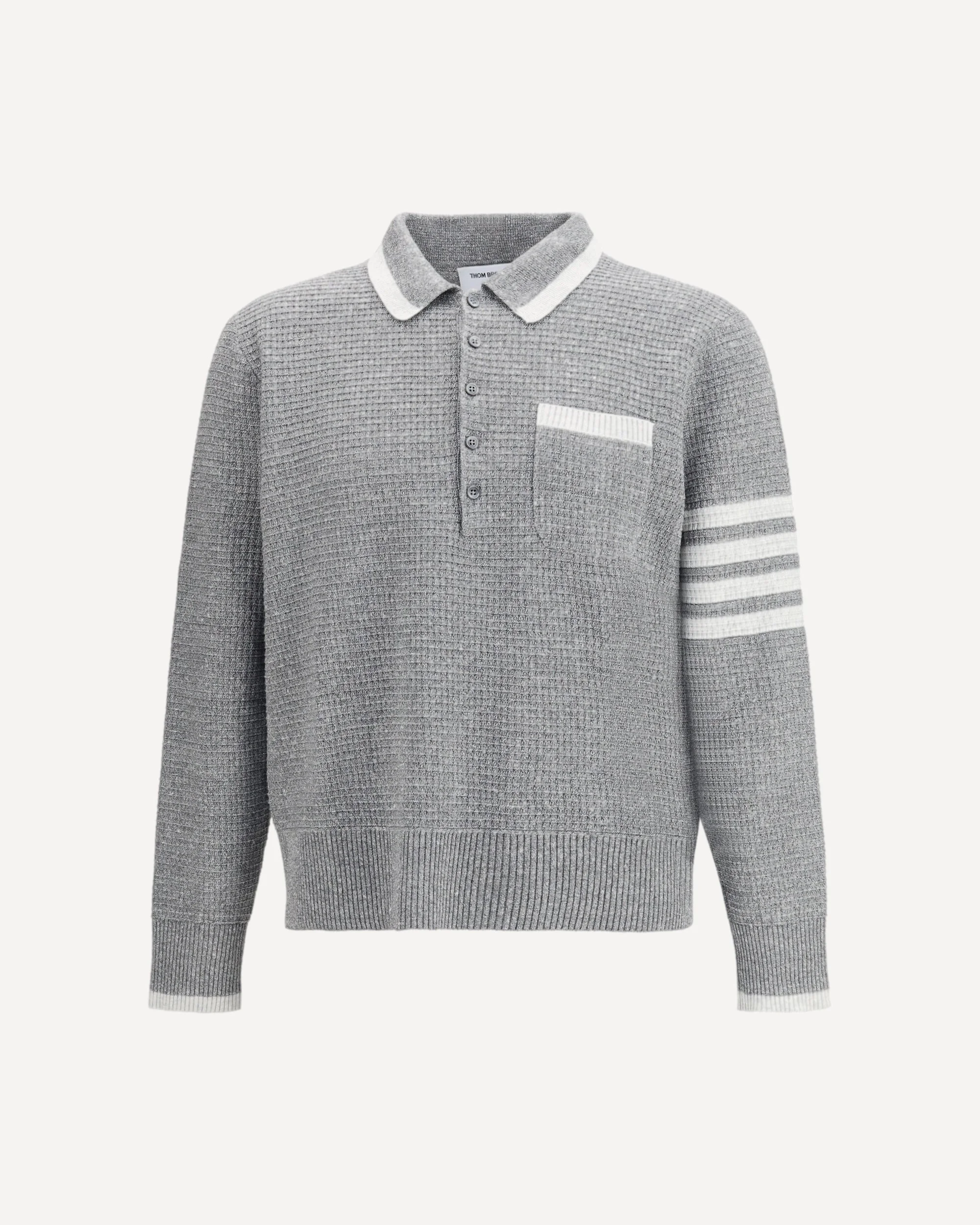 The knitted polo Shirt by Thom Browne delivers relaxed elegance enhanced by iconic detailing. Crafted from a refined wool and silk blend, it features a textured knit that adds depth and character to the design. The long-sleeved silhouette is finished with the signature four-bar stripe on the sleeve, while a chest pocket and button fastening balance functionality with style. A ribbed hem completes the piece with a clean and structured finish. DETAILS - Sku: MKP156AY6011_055 - Season: SS26 - Fit: Regular - Composition: GENERAL 68% Linen 32% Cotton - MADE IN ITALY