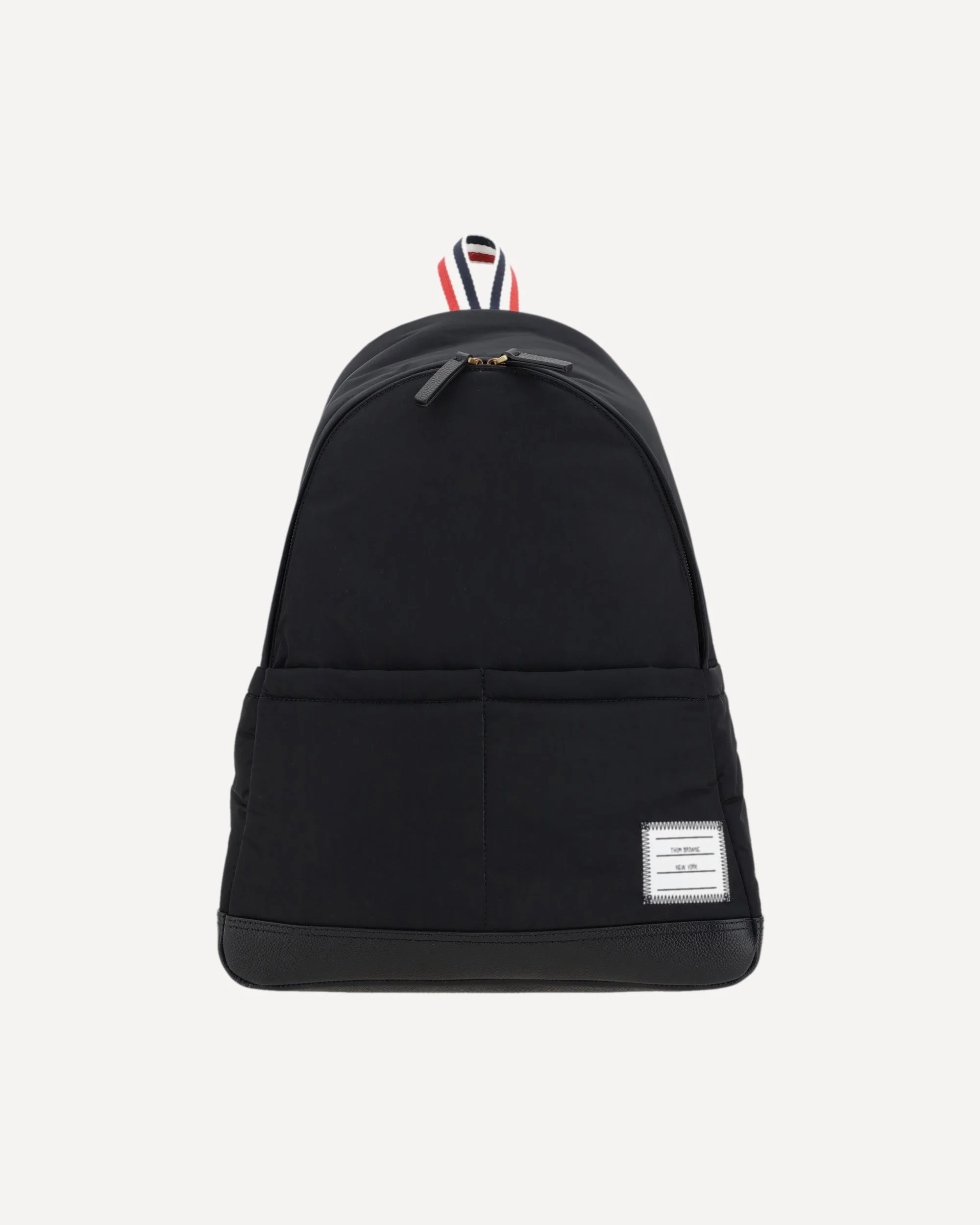 Thom Browne's Backpack features a double-slider zipper closure for easy access. Adjustable, padded shoulder straps provide comfort, while the top handle offers a second carrying option. Two side welt pockets and a front patch pocket provide ample space for essentials. The brand's iconic monogram patch applied to the front and the inner lining with the brand's classic colored bands add a distinctive touch. Inside, the backpack features a single compartment, combining practicality and style. DETAILS sku UAG210A07259_001 composition: POLYESTER 100% color group: BLACK gender: MAN season: SS25 size chart: UNI category name: BACKPACKS