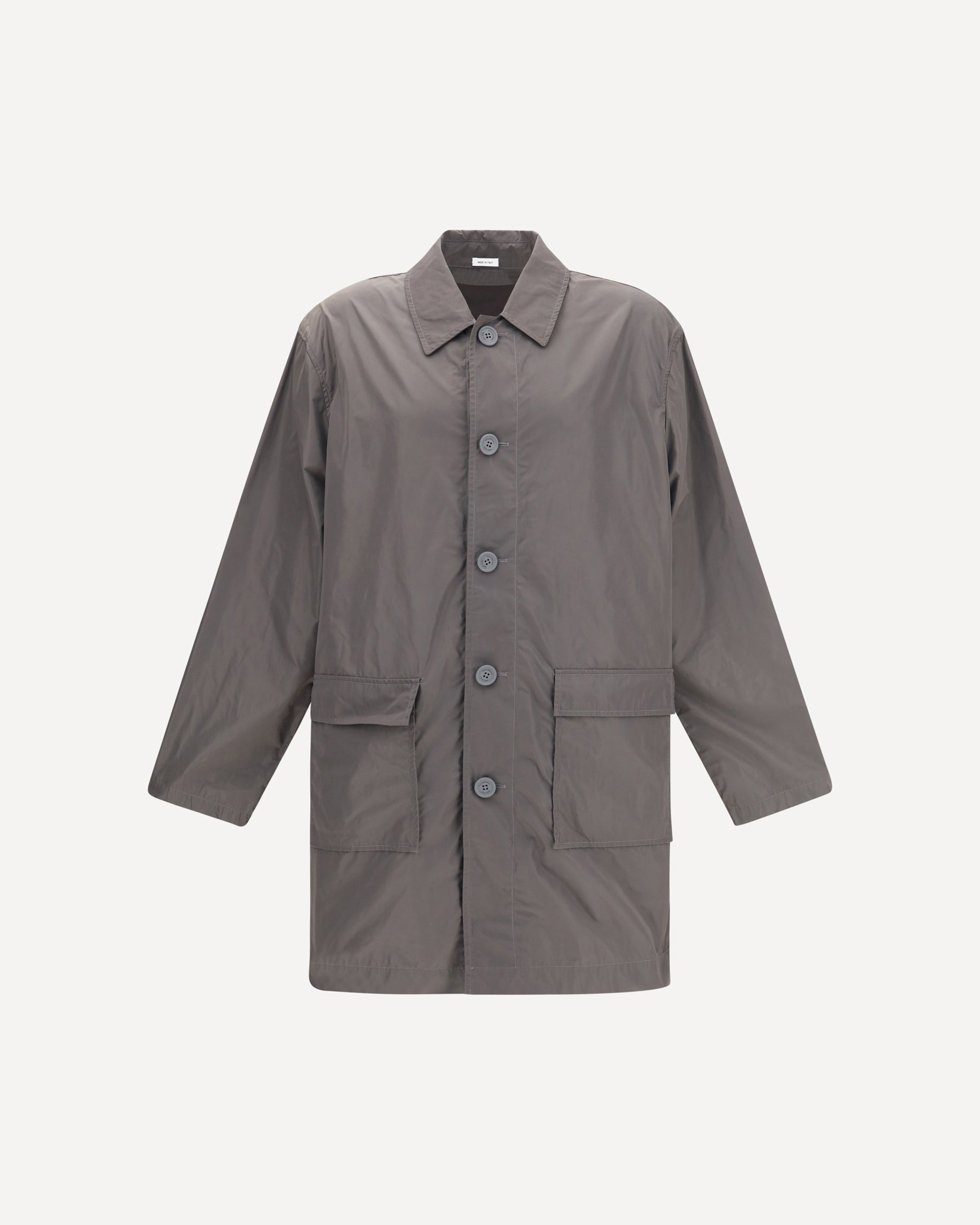 The Memory Tech Packable Smock by Thom Browne combines functionality and style in a lightweight, versatile piece that can be easily packed away into its removable pouch. It features a front button closure, two front flap pockets, and an interior pocket with name tag, along with a detachable interior pocket. Side button vents are finished with the brand’s signature striped grosgrain trim, while the back loop tab pays tribute to athletic heritage. DETAILS - Sku: MOT099PF0967_025 - Season: AW25 - Fit: Oversize - Composition: GENERAL 60% Linen 40% Cotton