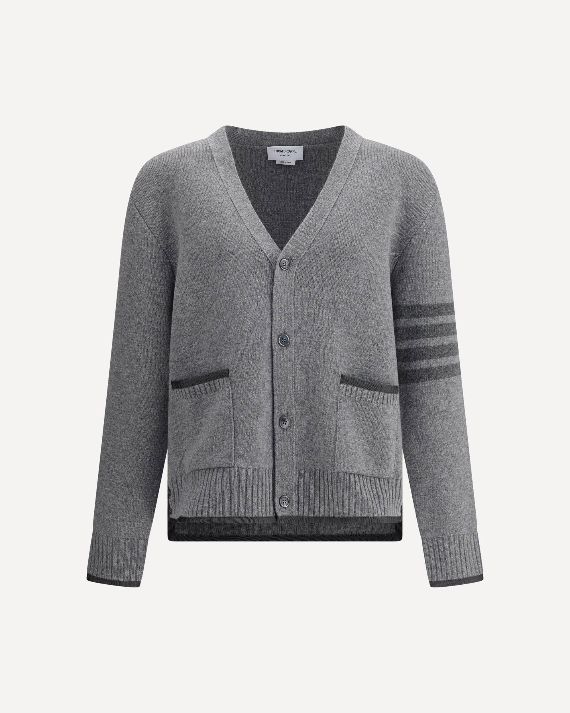 Thom Browne's merino wool Cardigan is a classic revisited with iconic details and sartorial care. It features a V-neck, front button closure and two patch pockets with contrasting piping. The hem and cuffs are ribbed, while contrasting bands on the left sleeve and discreet side slits add a distinctive touch to the essential design. DETAILS - Sku: MKC608AY1029_055 - Season: AW25 - Fit: Regular - Composition: GENERAL 100% Merino Wool - MADE IN ITALY