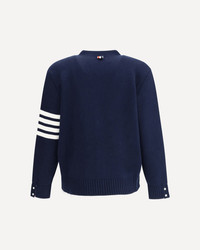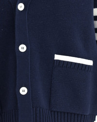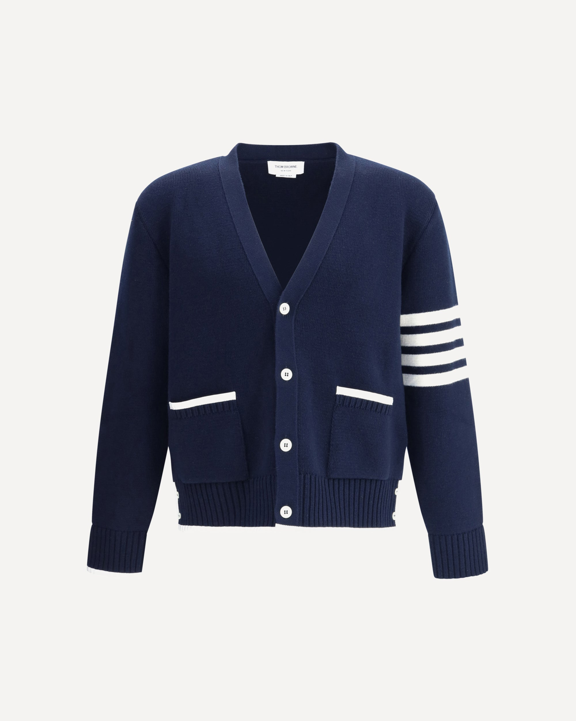 Thom Browne's merino wool Cardigan is a classic revisited with iconic details and sartorial care. It features a V-neck, front button closure and two patch pockets with contrasting piping. The hem and cuffs are ribbed, while contrasting bands on the left sleeve and discreet side slits add a distinctive touch to the essential design. DETAILS - Sku: MKC608AY1029_415 - Season: AW25 - Fit: Regular - Composition: GENERAL 100% Fleece Wool - MADE IN ITALY