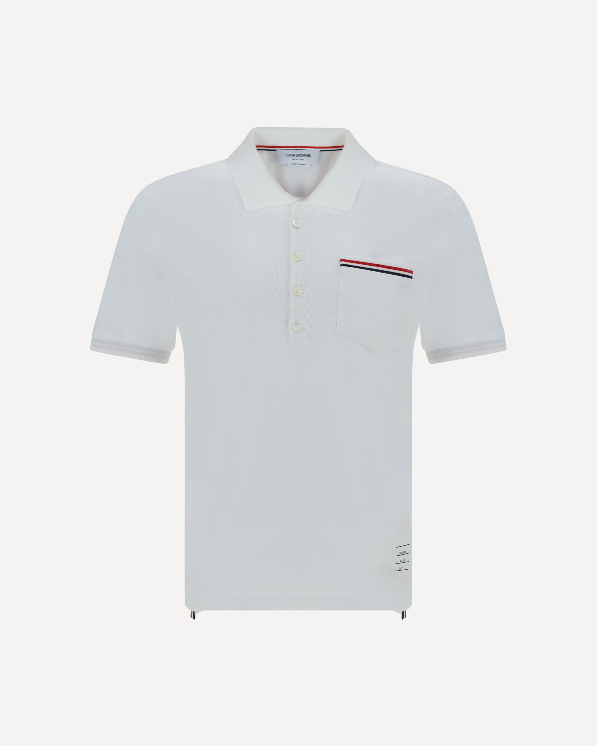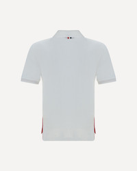 Cotton Polo Shirt by Thom Browne, classic collar, tone on tone buttons, patch pocket on the front with detail iconic contrasting bands, side slits with buttons. DETAILS sku MJP022A01455_100 composition : COTTON 100% color group : WHITE gender : MAN season : AW23 size chart : MAN NUMERIC category name : POLO SHIRTS