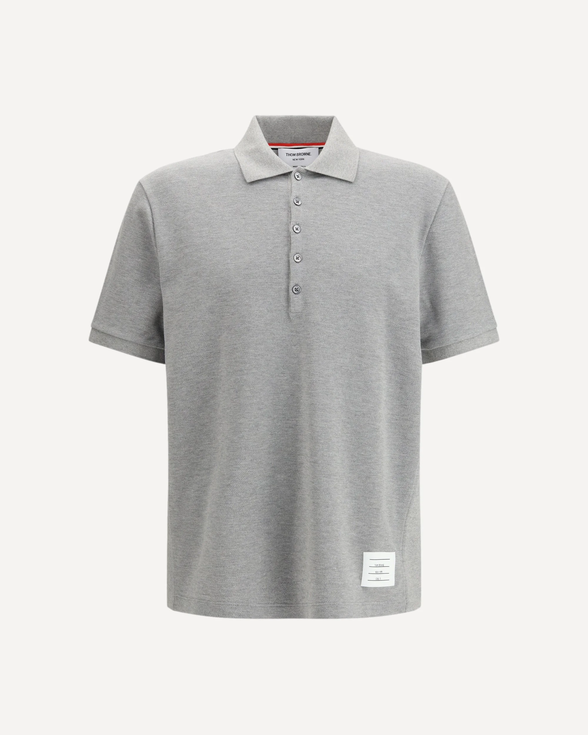The Cotton Polo Sweater by Thom Browne features a classic collar and buttons on the front for a stylish and practical closure. The brand's iconic monogram patch applied to the front adds a distinctive touch. The iconic contrasting horizontal bands on the side panels recall the brand's signature style, creating a unique visual detail. A sophisticated and trendy garment, perfect for a casual-chic look. DETAILS - Sku: MJP110P00050_055 - Season: SS26 - Fit: Regular - Composition: GENERAL 100% Cotton - MADE IN ITALY