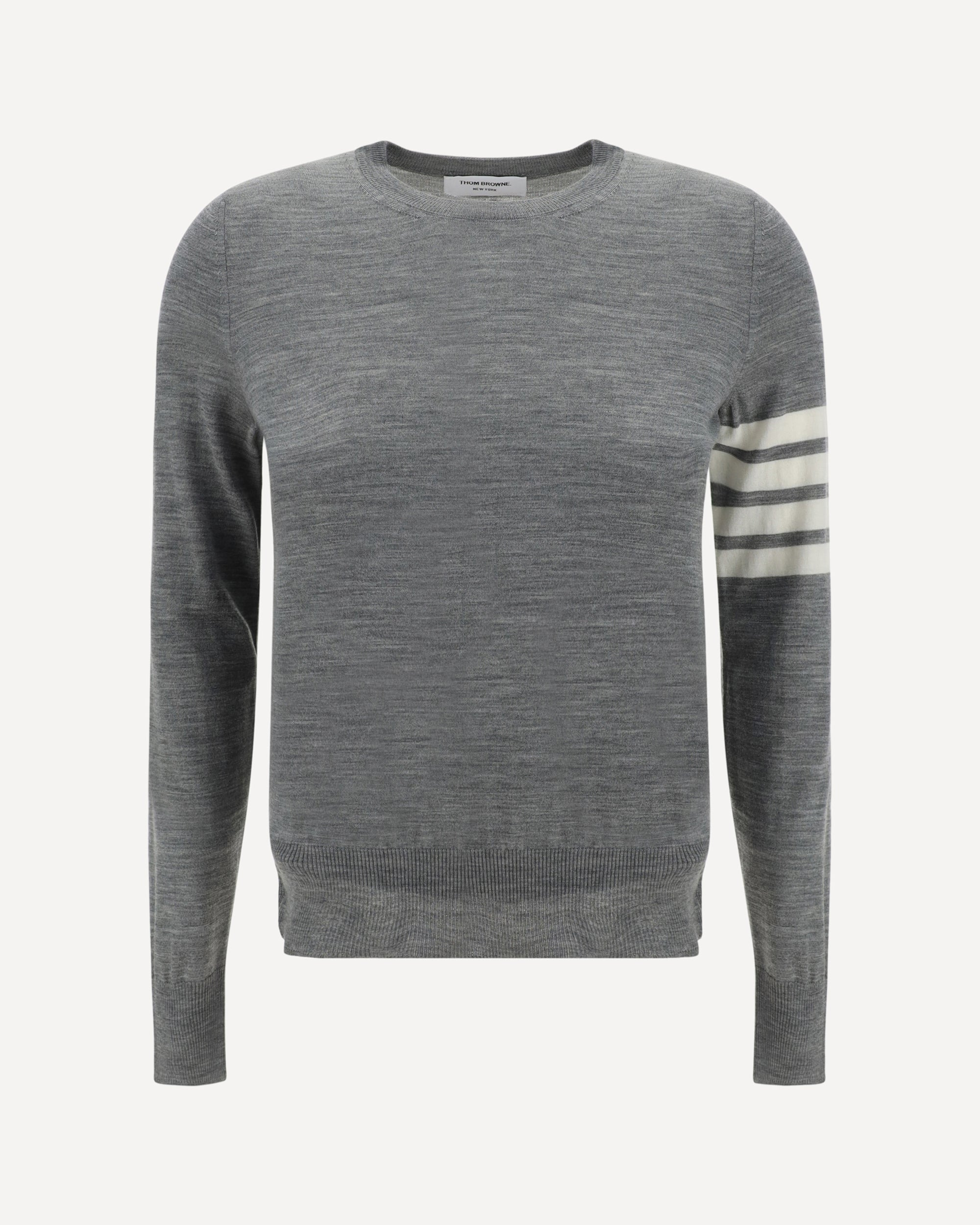 Fleece Wool Sweater by Thom Browne, ribbed crew neck, ribbed hem with side buttons to adjust slits, ribbed cuffs with buttons, slim fit, iconic brand horizontal stripes on left arm. DETAILS sku FKA280AY1014_055 composition : FLEECE WOOL 100% color group : GREY gender : WOMAN season : SS24 size chart : WOMAN IT category name : KNITWEAR