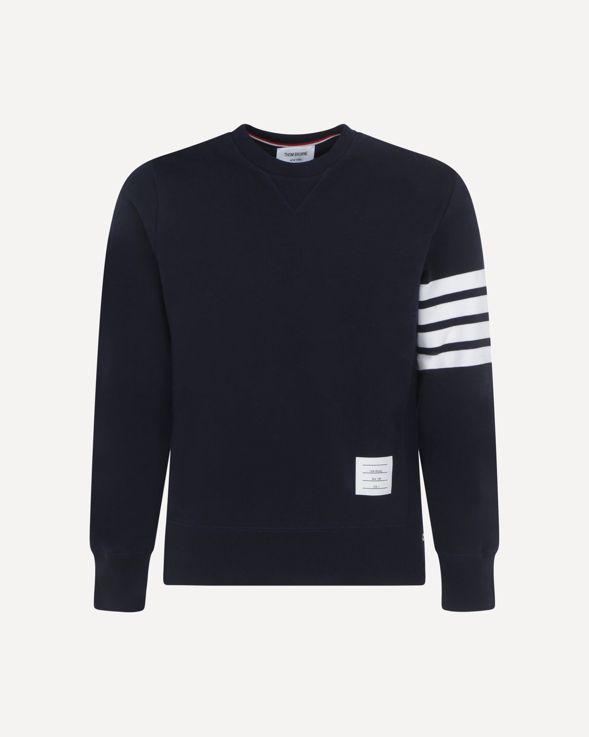 Cotton Sweatshirt from Thom Browne, round neck, long sleeves ribbed cuffs, white stripes on the left, elastic waistband with bottom. Brand logo inside and exterior label. DETAILS sku MJT021H00535_461 composition : COTTON 100% color group : BLUE gender : MAN season : AW23 size chart : MAN NUMERIC category name : SWEATSHIRTS