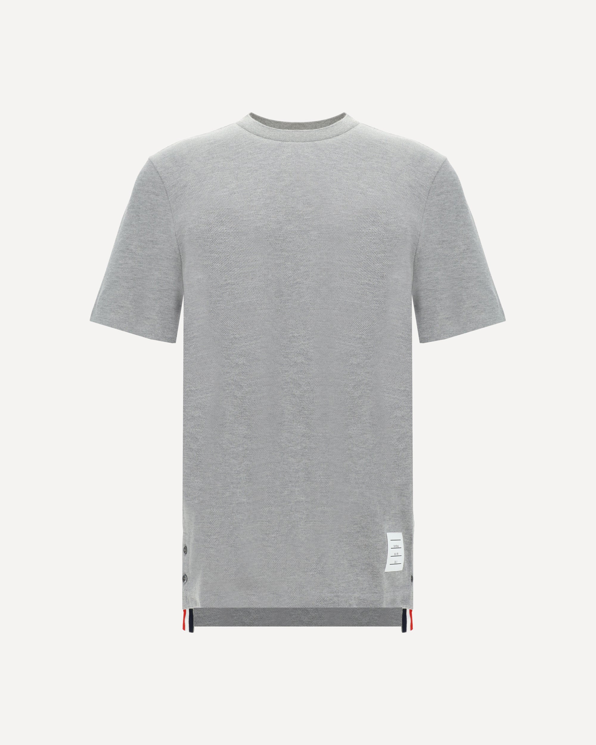 Cotton T-Shirt by Thom Browne, ribbed crew neck collar, lateral slits with buttons, back stripe bar. DETAILS sku MJS056A00050_055 composition: COTTON 100% color group: GREY gender: MAN season: AW24 size chart: NUMERIC category name: T-SHIRTS