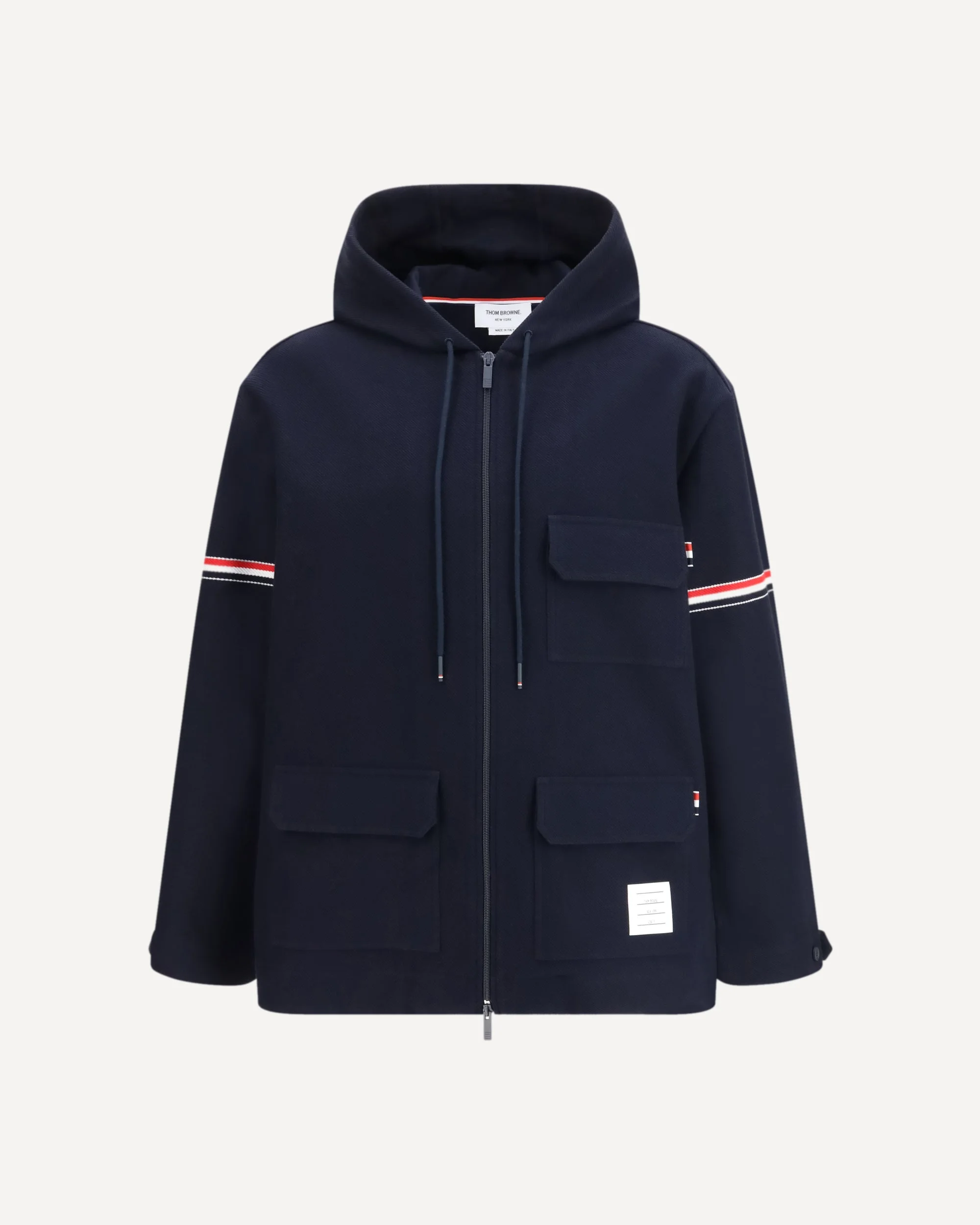 The technical twill parka Jacket by Thom Browne is the perfect blend of elegance and practicality. Featuring a two-way front zip closure and adjustable drawstring hood, it guarantees comfort and protection. The iconic colored stripes on the sleeves and signature patch on the front add a distinctive touch, symbolizing the brand's exclusive design. Perfect for those looking for a modern, functional, and recognizable look. DETAILS - Sku: MJT567AJ0250_415 - Season: SS26 - Fit: Regular - Composition: GENERAL 100% Cotton - MADE IN ITALY