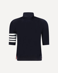 Thom Browne's Virgin Wool Turtleneck Sweater is a refined and sophisticated piece that combines elegance with distinctive details. With a ribbed turtleneck and short sleeves, it features a monochrome pattern enhanced by contrasting hems. The brand's iconic bands on the left sleeve and the ribbed hem with slight side slits add a touch of originality. DETAILS - Sku: FKA434AY1014_415 - Season: AW25 - Fit: Regular - Composition: GENERAL 1% Polyamide 99% Fleece Wool - MADE IN ITALY