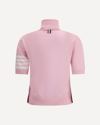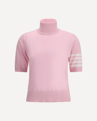 Thom Browne's Virgin Wool Turtleneck Sweater is a refined and sophisticated piece that combines elegance with distinctive details. With a ribbed turtleneck and short sleeves, it features a monochrome pattern enhanced by contrasting hems. The brand's iconic bands on the left sleeve and the ribbed hem with slight side slits add a touch of originality. DETAILS - Sku: FKA434AY1014_680 - Season: AW25 - Fit: Regular - Composition: GENERAL 1% Polyamide 99% Fleece Wool - MADE IN ITALY