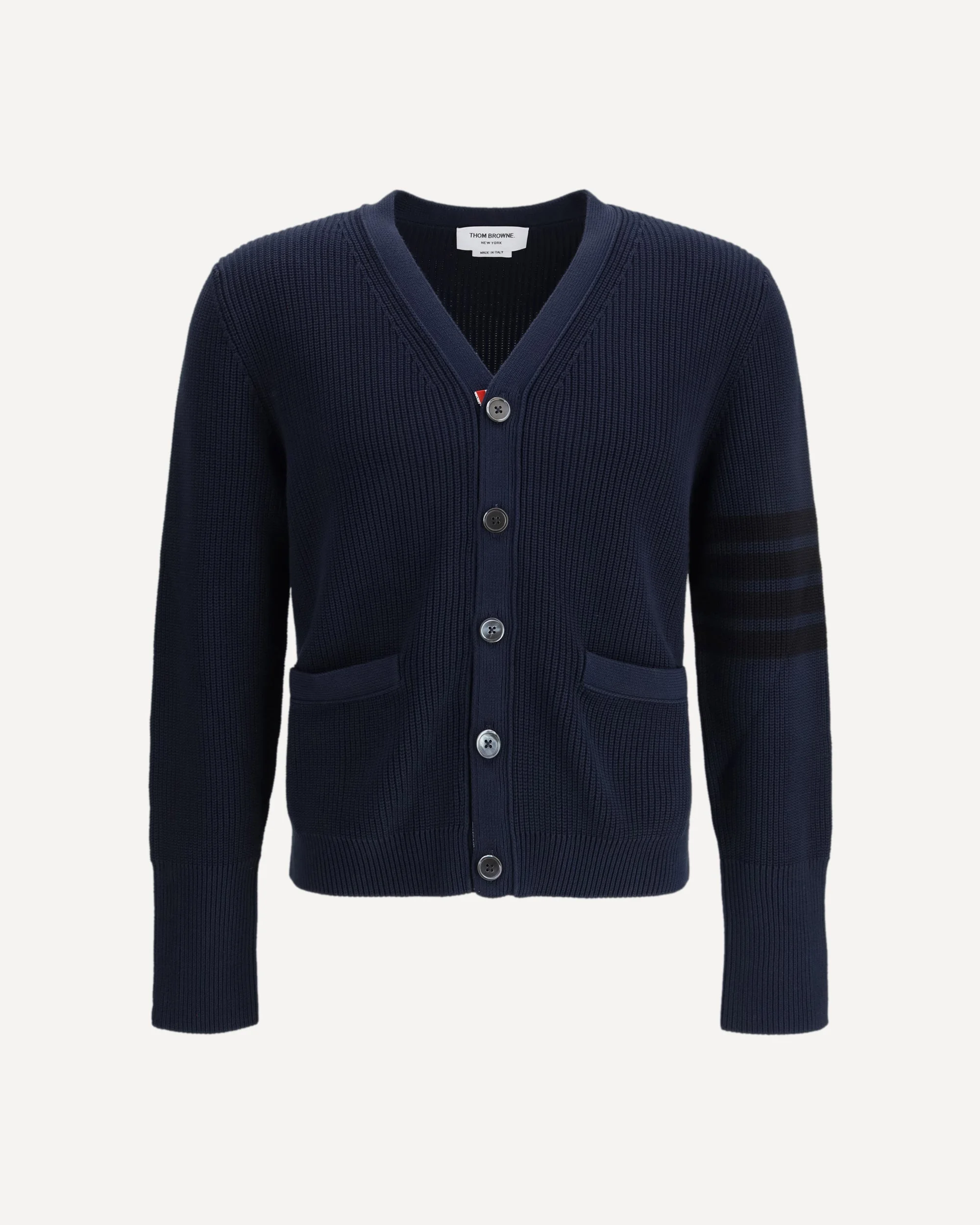 The V-neck Cardigan by Thom Browne is an elegant design featuring a V-shaped neckline and a button-front closure. It includes applied front slip pockets, signature striped armbands, and the brand’s iconic grosgrain loop tab at the back of the neck. The buttoned side vents and cuffs are finished with Thom Browne’s characteristic striped grosgrain trim, adding the label’s unmistakable touch. DETAILS - Sku: MKC635AY3065_415 - Season: SS26 - Fit: Regular - Composition: GENERAL 100% Cotton - MADE IN ITALY