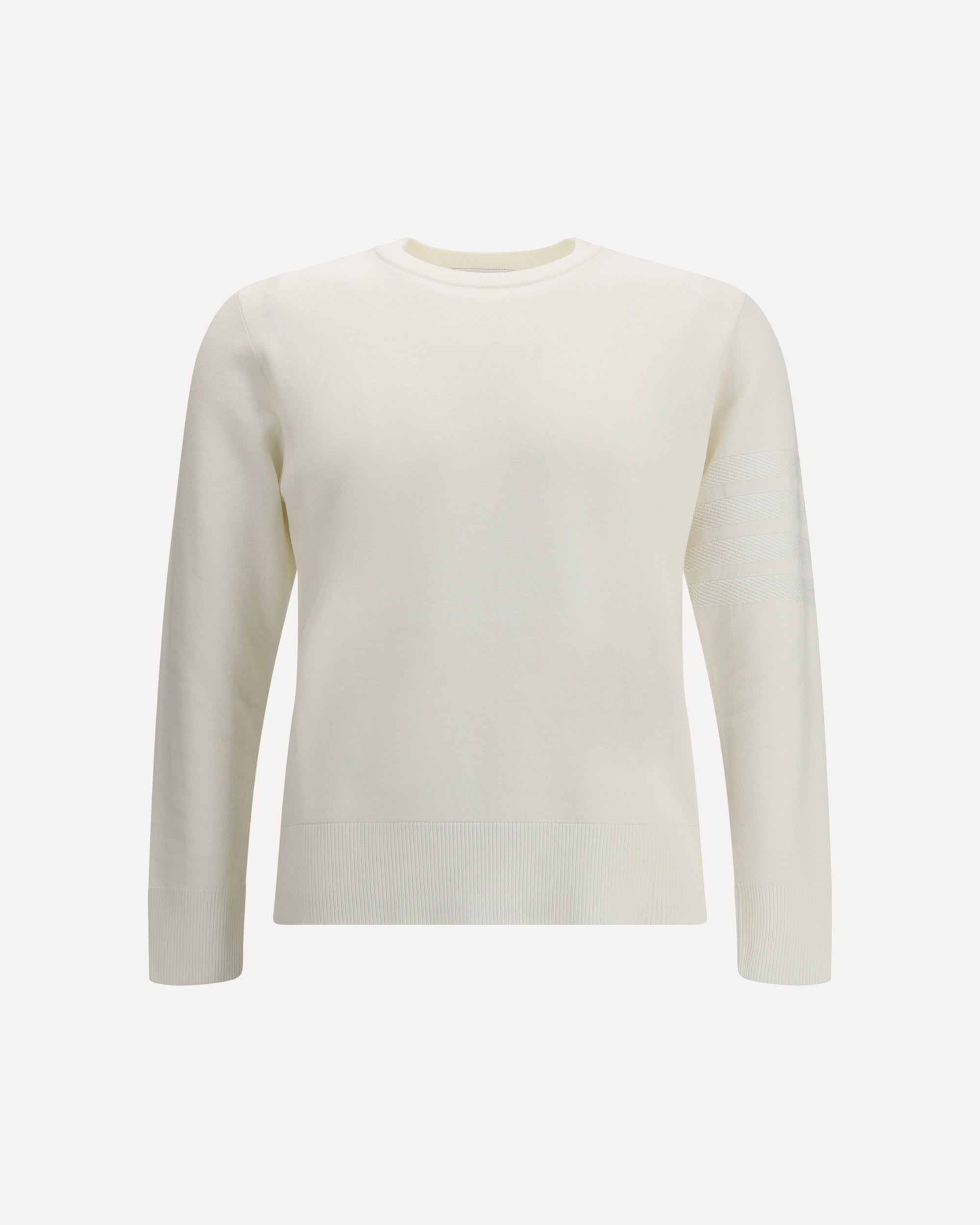 Thom Browne's virgin wool Sweater features a ribbed crew neck, cuffs and hem. On the left sleeve stand out the iconic tone-on-tone bands, the brand's signature detail that adds a touch of understated elegance to the garment. DETAILS - Sku: MKA566AY1055_100 - Season: AW25 - Fit: Regular - Composition: GENERAL 68% Fleece Wool 20% Linen 9% Cotton 3% Polyamide - MADE IN ITALY