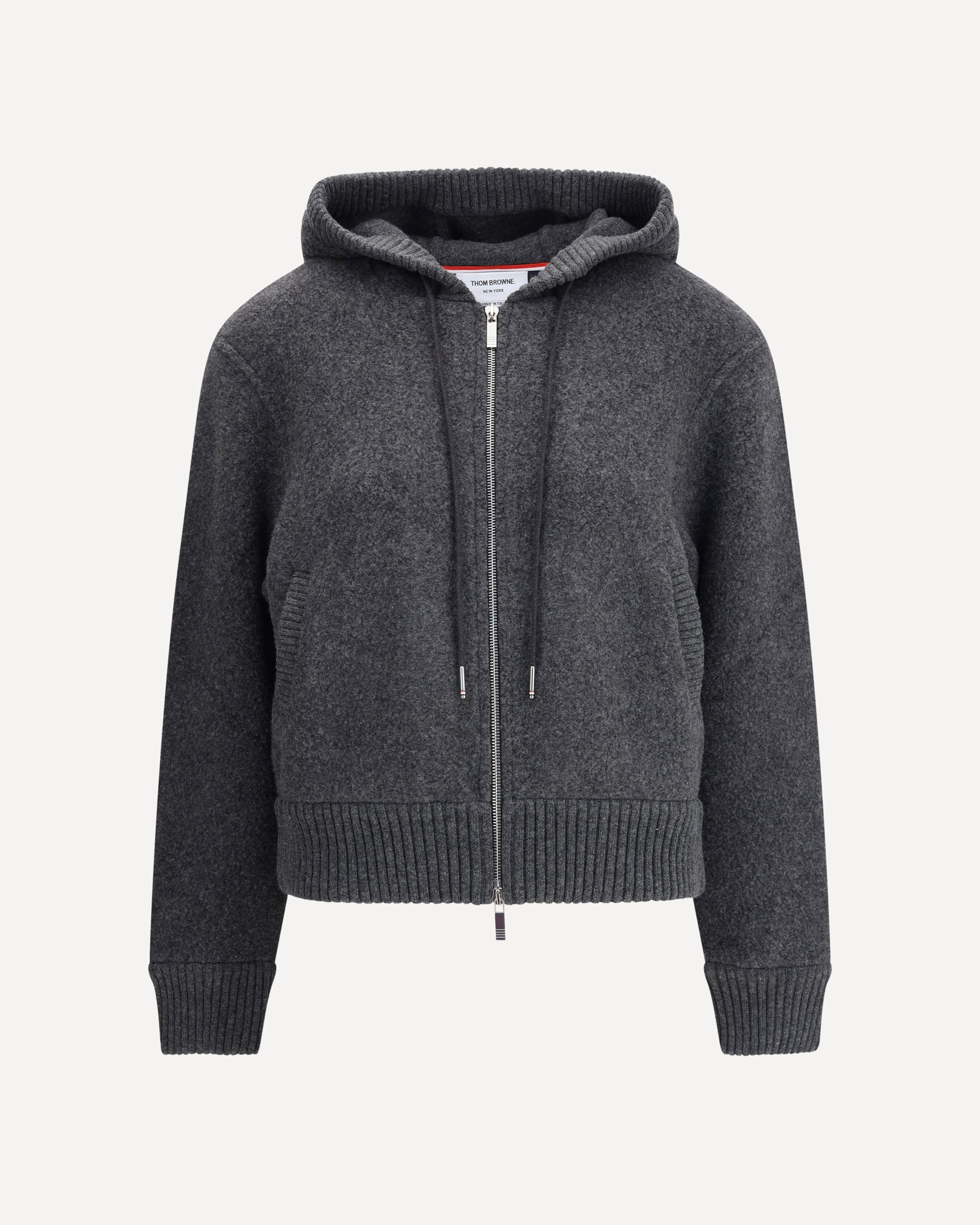 Wool Sweatshirt by Thom Browne with adjustable drawstring hood and ribbed hem. The style features a double-slider front zipper closure, two side welt pockets, and ribbed cuffs and hem for a comfortable fit and a refined design. DETAILS - Sku: FJT349BJ0100_015 - Season: AW25 - Fit: Regular - Composition: GENERAL 100% Wool - MADE IN ITALY