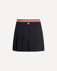 Thom Browne Mini Skirt made from high-quality wool, featuring a pleated design that adds movement and character to the garment. It features a front button closure and the brand's signature iconic contrasting bands on the front and waistband. Side slits and an asymmetric hemline with a longer back panel complete the design for a modern and original touch. A versatile and sophisticated mini skirt, perfect for a contemporary look. DETAILS - Sku: FGCA27A02872_001 - Season: AW25 - Fit: Regular - Composition: GENERAL 50% Wool 50% Polyamide - MADE IN ITALY