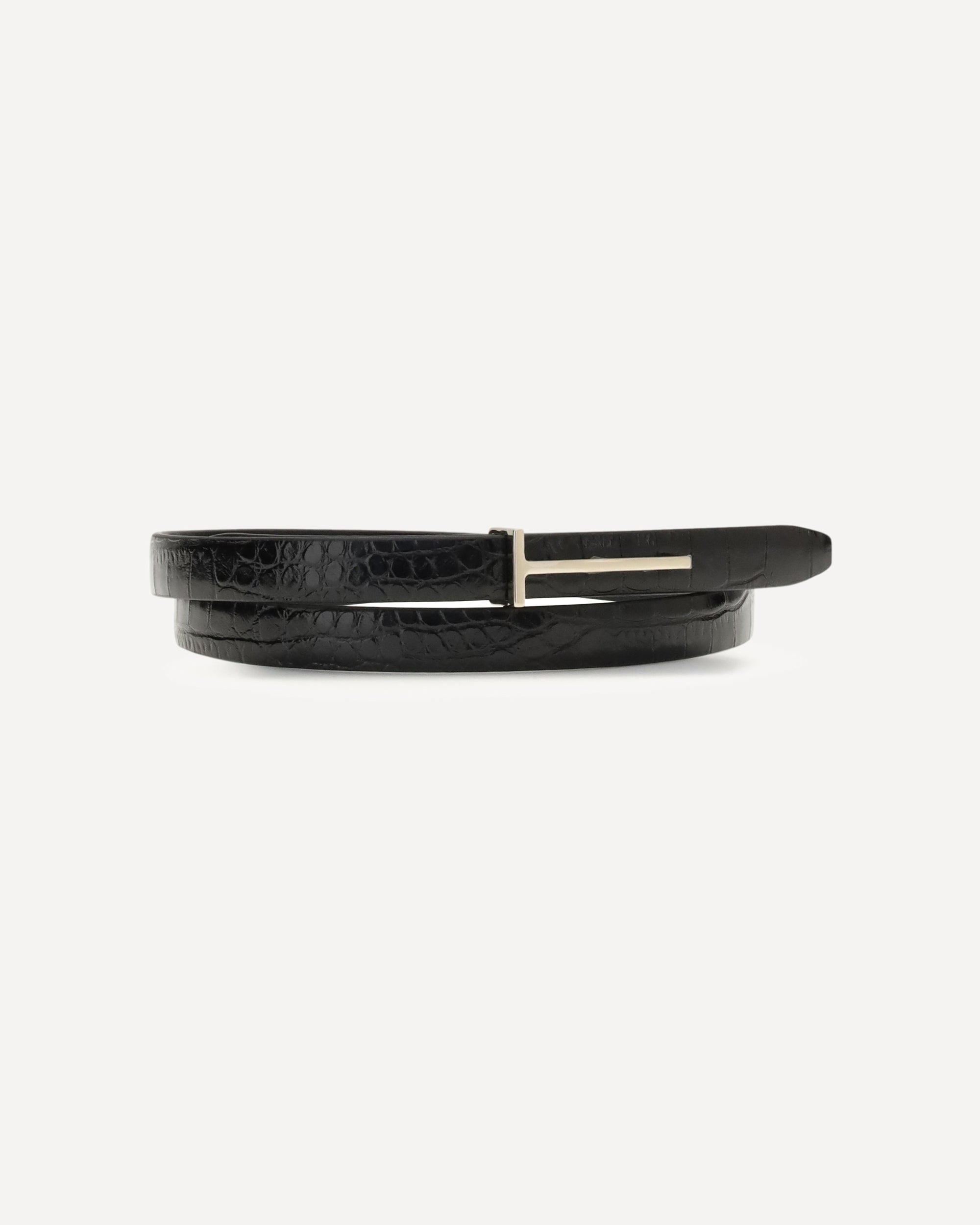 The Belt with T buckle by Tom Ford is crafted from black leather with an embossed crocodile effect. Elegant and structured, it’s finished with the brand’s iconic T buckle closure, adding a sophisticated and bold touch that elevates any look. DETAILS - Sku: WB333LCL395P_1N001 - Season: AW25