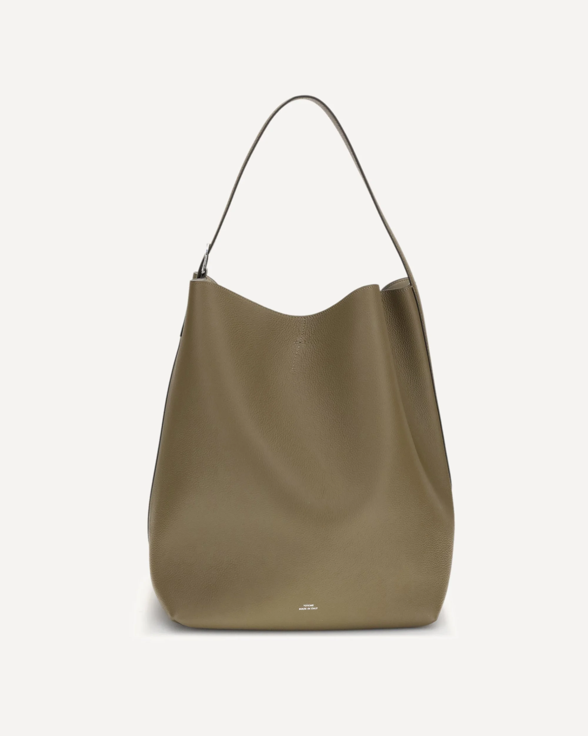 The Effortless Tote Bag by Toteme, crafted in Italy from supple grained leather that drapes naturally against the body. The minimalist silhouette features an adjustable strap with a silver-tone metal buckle. A small clasp opens to a beige resin-coated interior with two slip pockets, offering discreet, everyday organization. Refined yet practical, it’s the perfect bag to complement daily outfits. DETAILS - Sku: 234WAL853LE0030_356 - Season: SS26 - Dimension: 34x34x27 - Composition: GENERAL 100% Cow Leather - MADE IN ITALY