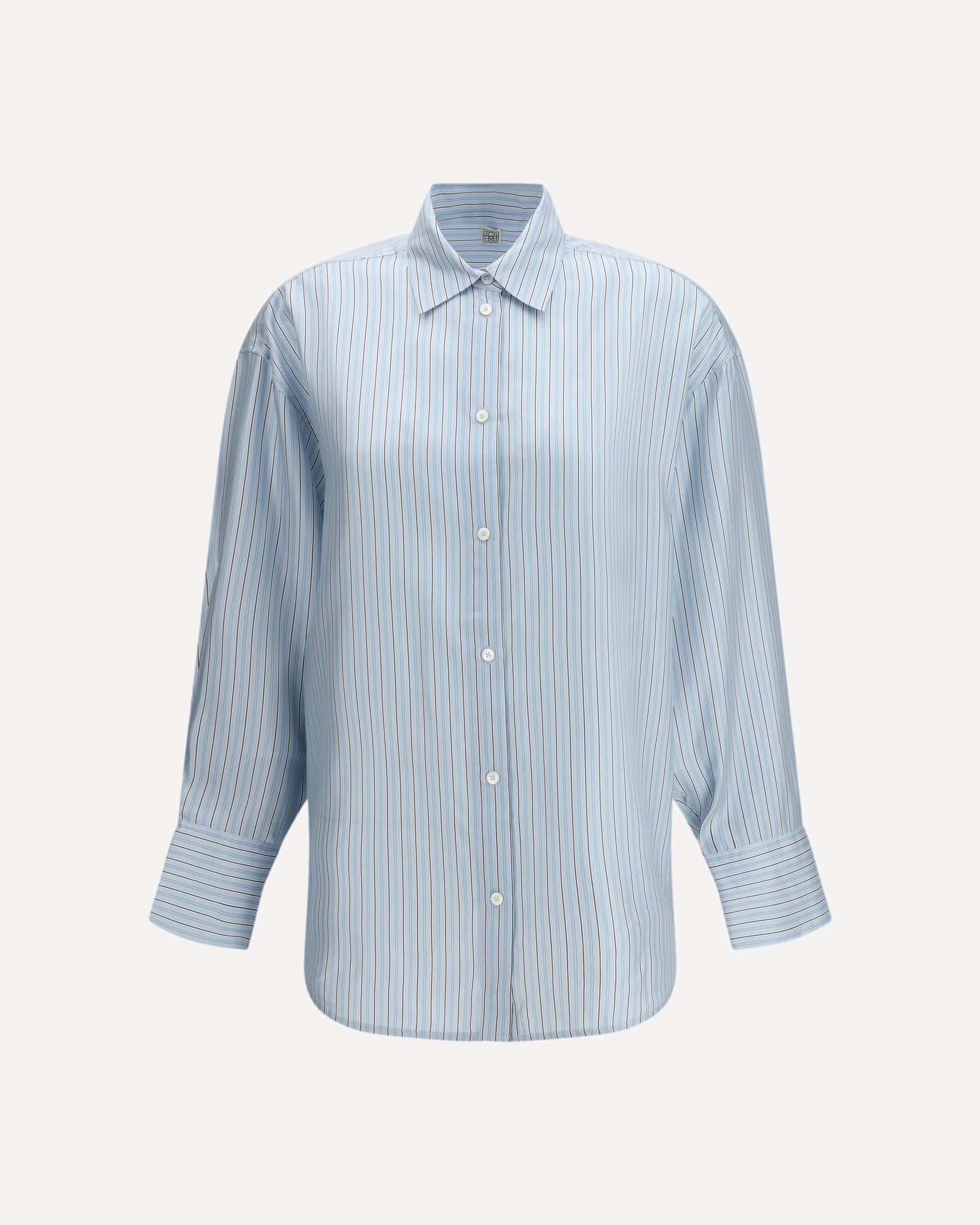 The oversized striped Shirt by Toteme is an elegant and contemporary garment, made from fine silk with a striped pattern. The classic collar and button placket add a touch of refinement, while the buttoned cuffs complete the design with a sophisticated touch. The wide, two-part sleeves offer an additional feeling of lightness and fluidity. The T-seam on the back gives the garment a distinctive detail. DETAILS - Sku: 261WRT0700FB0553_339 - Season: SS26 - Fit: Regular - Composition: GENERAL 100% Silk - MADE IN CHINA