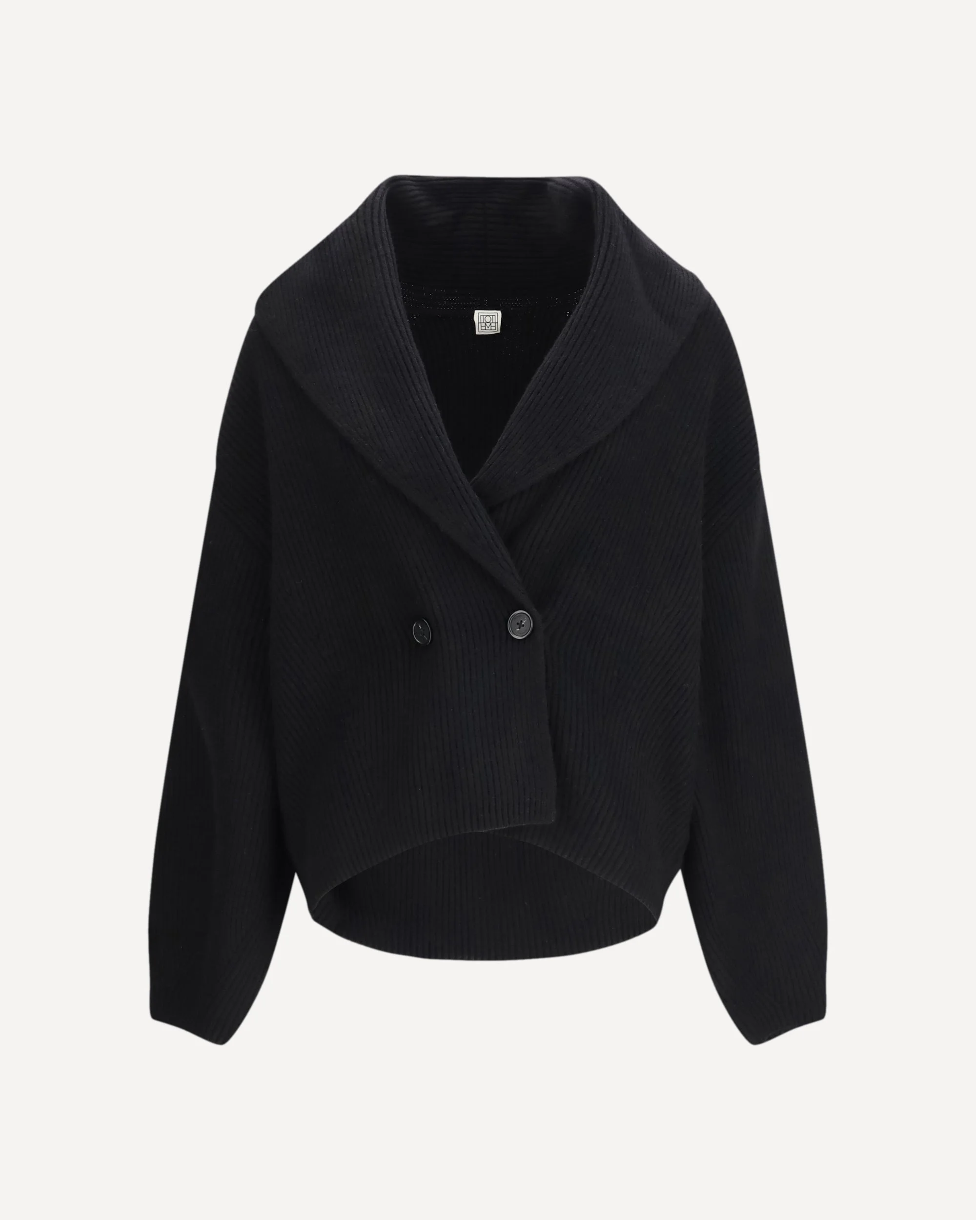 The shawl-lapel Cardigan by Toteme embodies a relaxed yet refined aesthetic, designed for a minimalist and sophisticated wardrobe. Crafted from heavyweight ribbed wool knit, it features an oversized silhouette enhanced by wide sleeves and low armholes. The double-breasted button closure and shawl lapels add a timeless, elegant character, making it a statement layering piece for everyday wear. DETAILS - Sku: 251WRT4354YA0239_001 - Season: SS26 - Fit: Regular - Composition: GENERAL 100% Wool - MADE IN CHINA