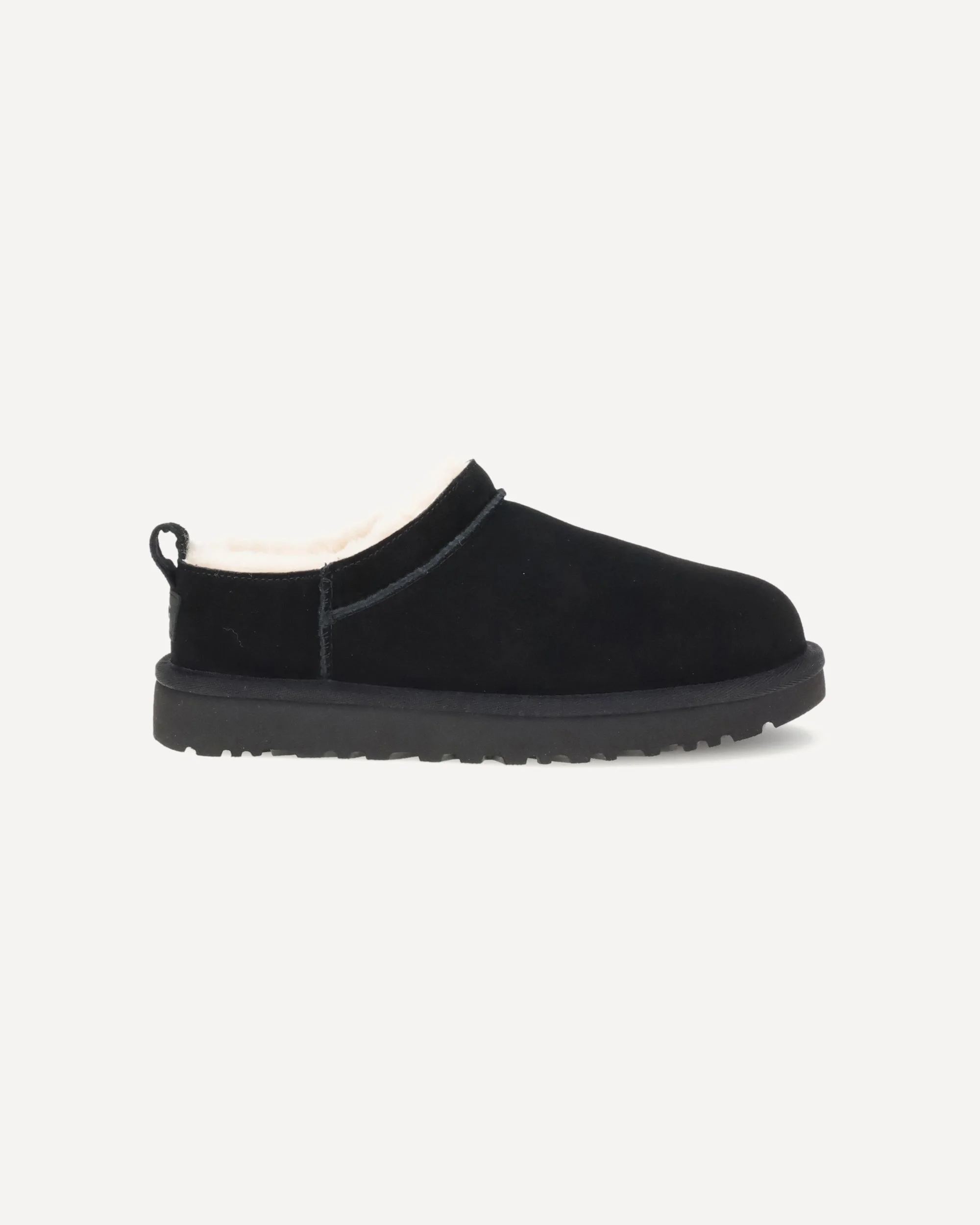 The Classic micro Ankle Boots by UGG are a compact version of the brand's iconic model, designed to combine comfort and versatility. The upper is made of water-repellent suede or water-resistant suede, perfect for tackling wet days. The back pull tab makes it easy to put on, while the soft sheepskin lining and insole ensure warmth and softness. The sugarcane-derived EVA sole ensures lightweight cushioning. The design is completed by a woven label with the UGG® logo on the insole and a leather label with an embossed logo on the heel. DETAILS - Sku: 1173891_BLK - Season: AW25 - Composition: UPPER 100% Chamois Leather SOLE 100% Rubber - MADE IN CHINA
