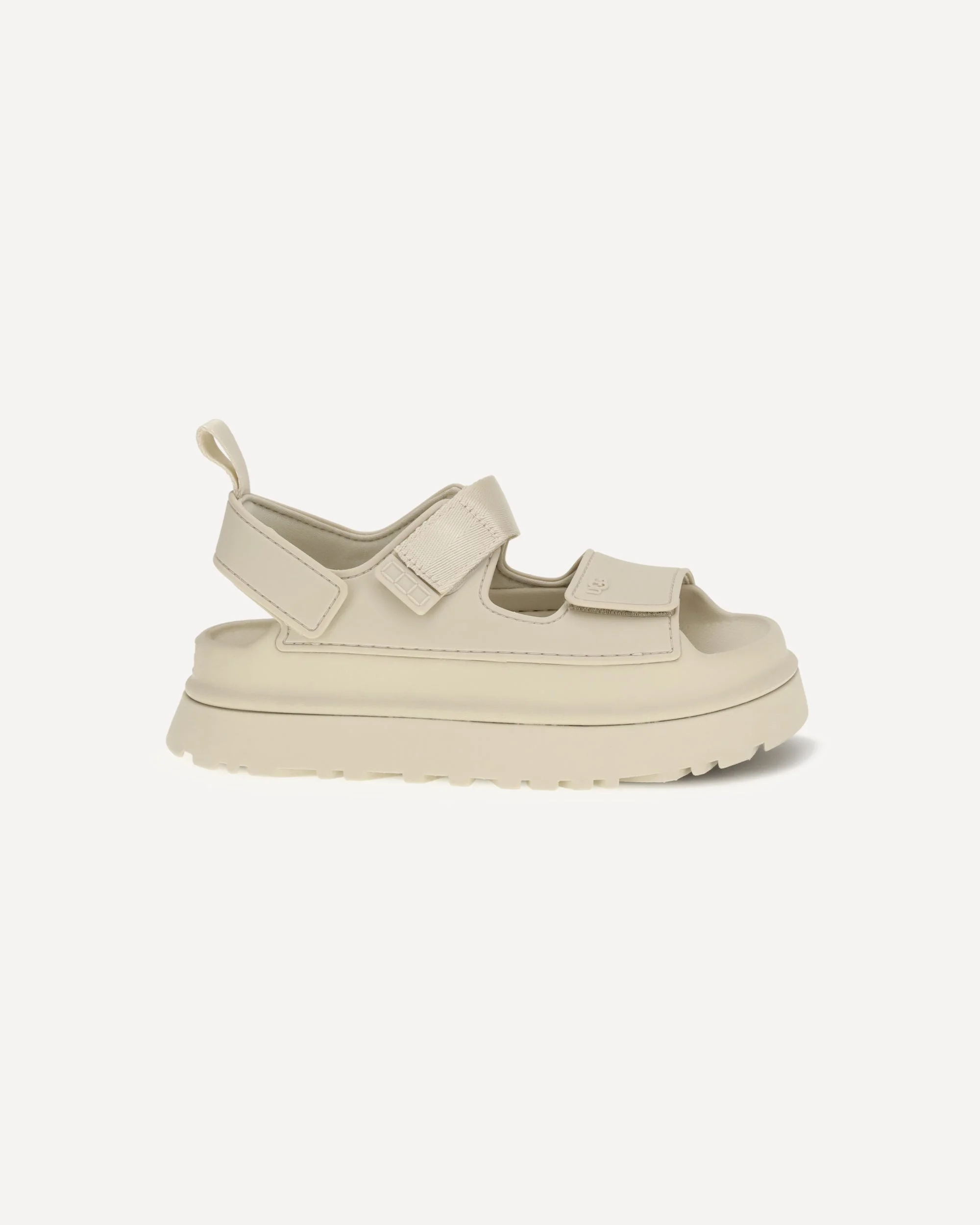 The Goldenglow Sandals by UGG combine contemporary design with sustainable materials, making them perfect for the summer season. The TPU upper is complemented by a back strap made from recycled materials, while the Velcro closure and fabric ankle strap ensure a practical and adjustable fit. The straps made from recycled polyester fibers and the fabric lining, also crafted from recycled materials, underscore the brand’s commitment to the environment. The EVA sole ensures lightness and comfort, making these sandals ideal for everyday wear that combines style and functionality. DETAILS - Sku: 1152685W_SSAL - Season: SS26 - Composition: UPPER 100% Recycled Polyester SOLE 100% Rubber - MADE IN CHINA