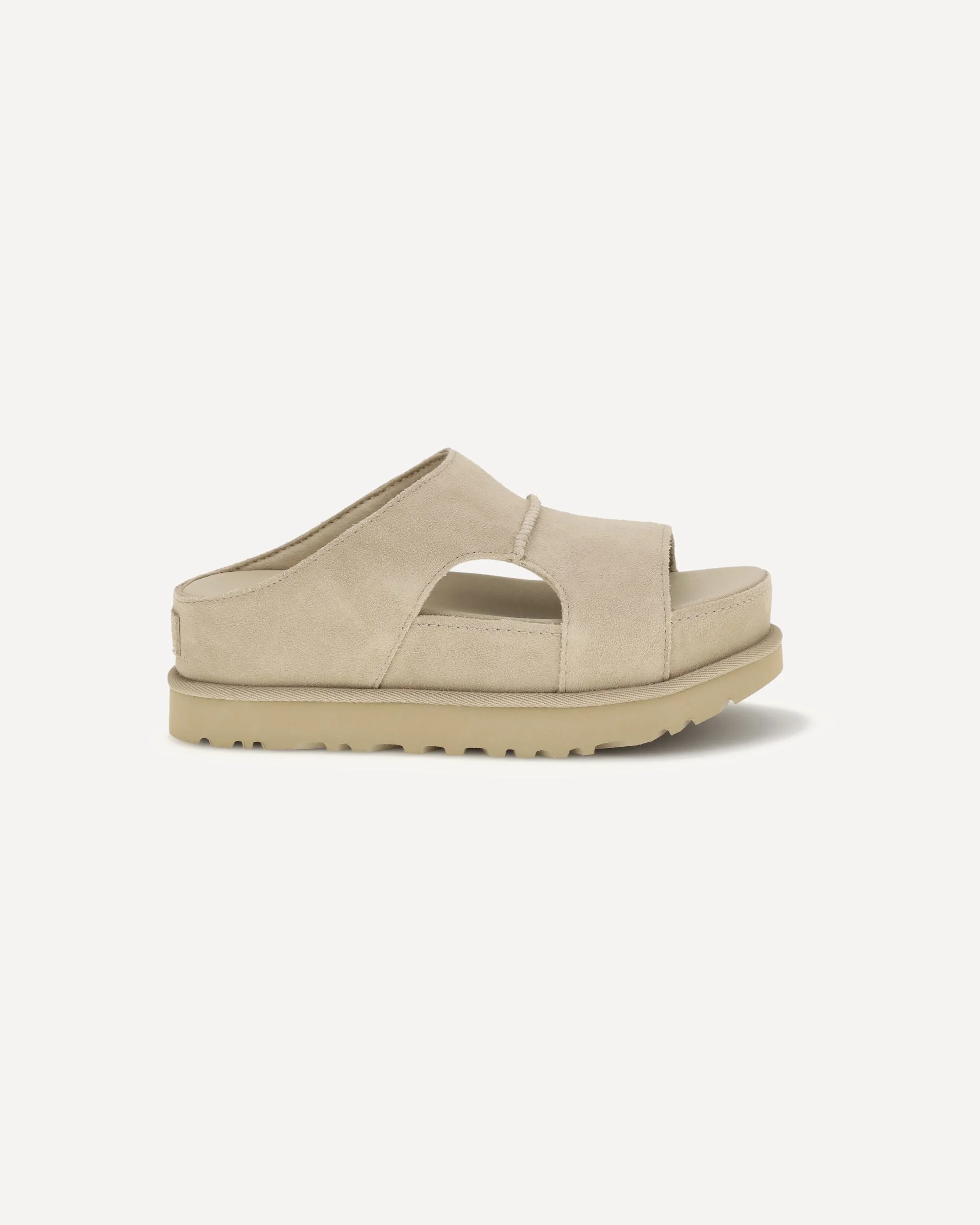 The Goldenstar Hi Cutout Sandals by UGG feature a suede upper and stand out for their refined, contemporary design. The raised double-stitched detail adds character and definition to the style, while the fabric insole made from recycled polyester ensures comfort and a commitment to sustainability. The EVA outsole provides lightness and cushioning for everyday wear, complemented by the embossed UGG® logo that adds a distinctive touch to the design. DETAILS - Sku: 1175132_SAN - Season: SS26 - Composition: UPPER 100% Calf Leather Bos Taurus SOLE 100% Rubber - MADE IN CHINA