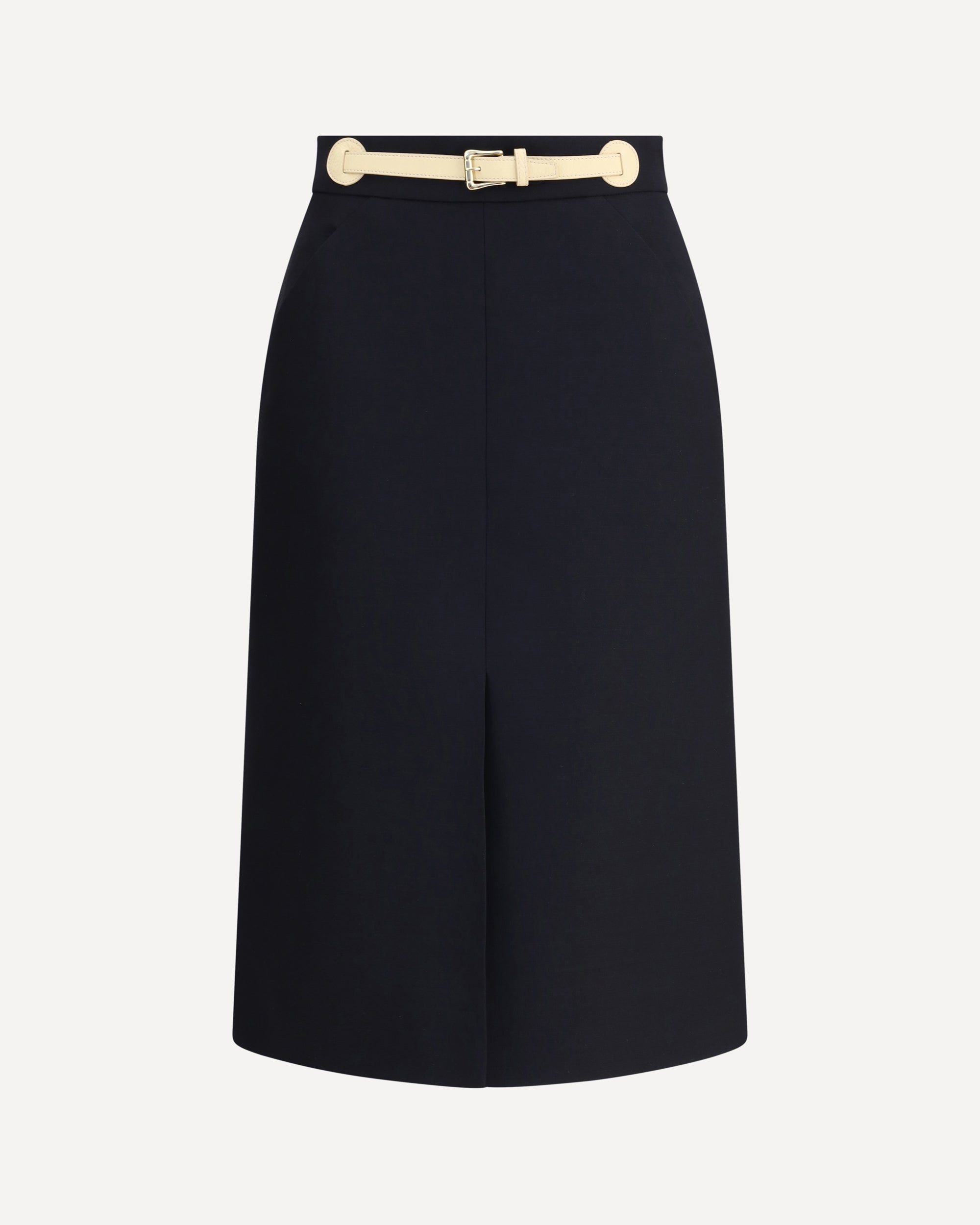 Valentino's midi Skirt combines elegance and functionality in a refined design. Featuring a back zipper closure, it has two side welt pockets and a built-in leather belt that enhances the waist. The front slit adds a feminine and contemporary detail, perfect for a sophisticated and versatile style. DETAILS - Sku: 7B3RADM51CF_TB1 - Season: AW25 - Fit: Regular - Composition: GENERAL 65% Fleece Wool 35% Silk - MADE IN ITALY