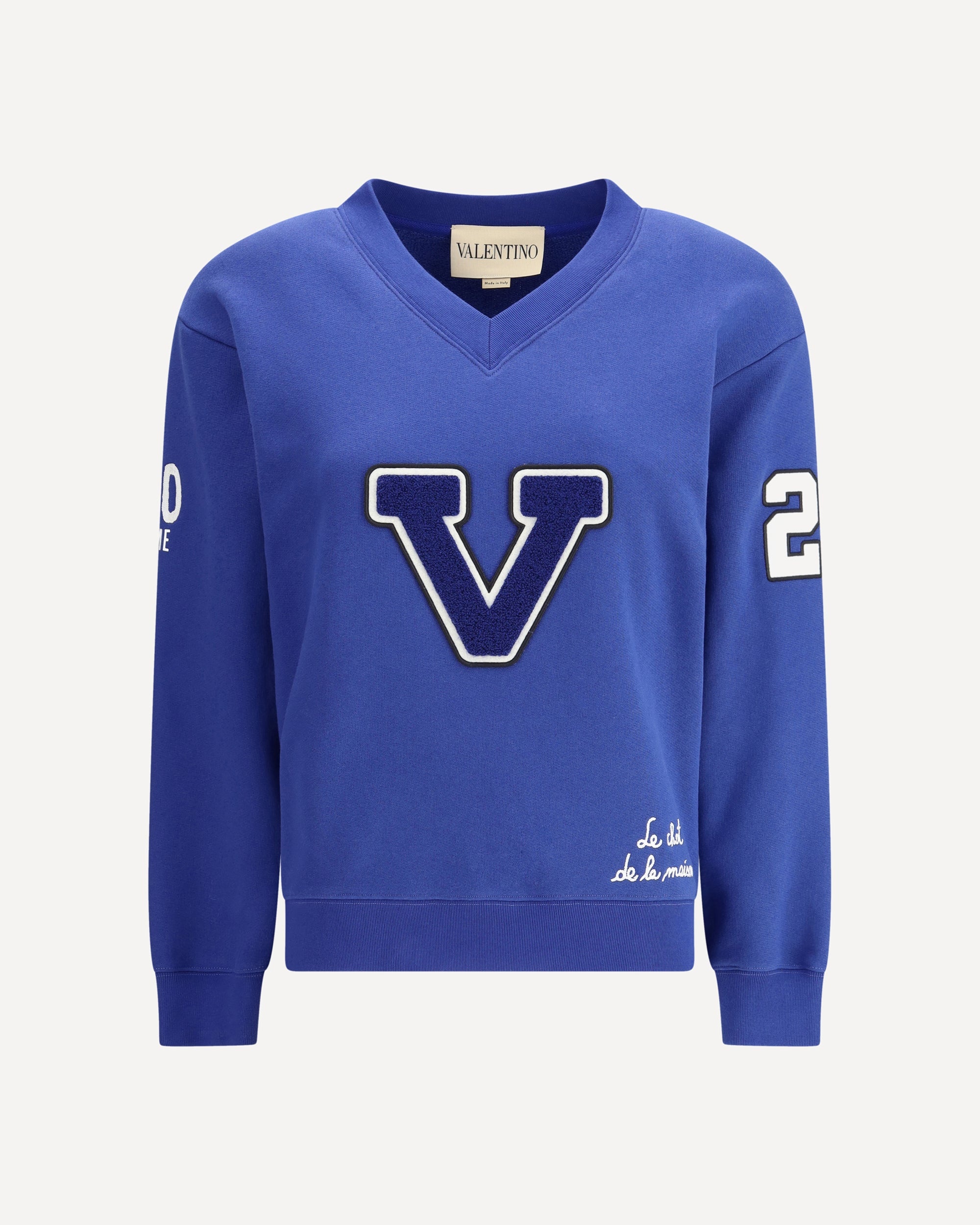 Valentino's cotton Sweatshirt features a refined V-neck and long sleeves that ensure comfort and style. A patch with the letter V stands out on the front, while on the back a "Le Chat de la Maison" embroidery adds an original touch. Ribbed edges complete the design with thoughtful, modern details. DETAILS - Sku: 7B3MF24V9KY_AF9 - Season: AW25 - Fit: Regular - Composition: GENERAL 100% Cotton - MADE IN ITALY